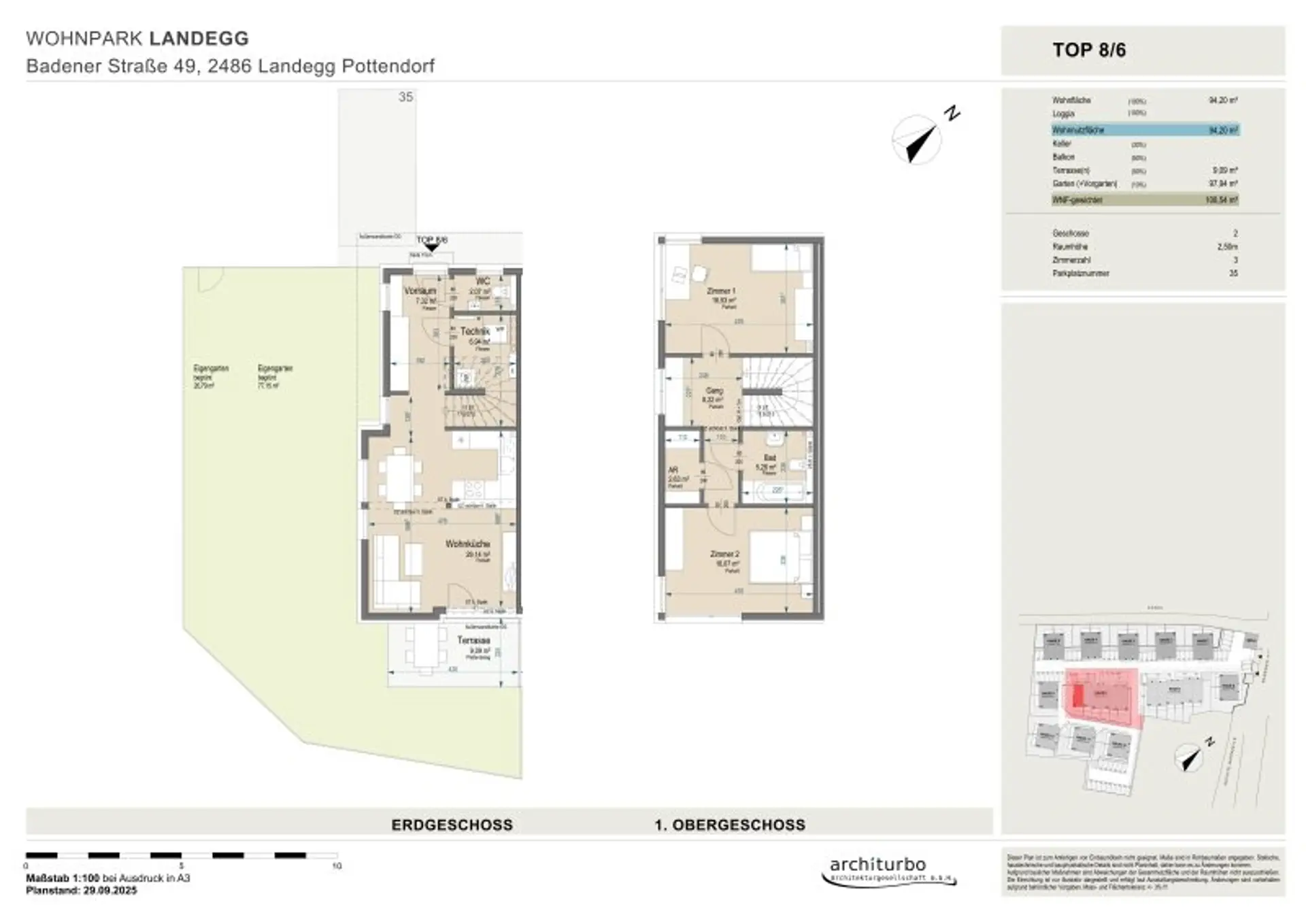 Mittig gelegenes ost-/westseitig ausgerichtetes 2-geschoßiges Reihenhaus mit 94 m2 Wohnnutzfläche, 9 m2 Terrassenfläche und 98 m2 Gartenfläche.
