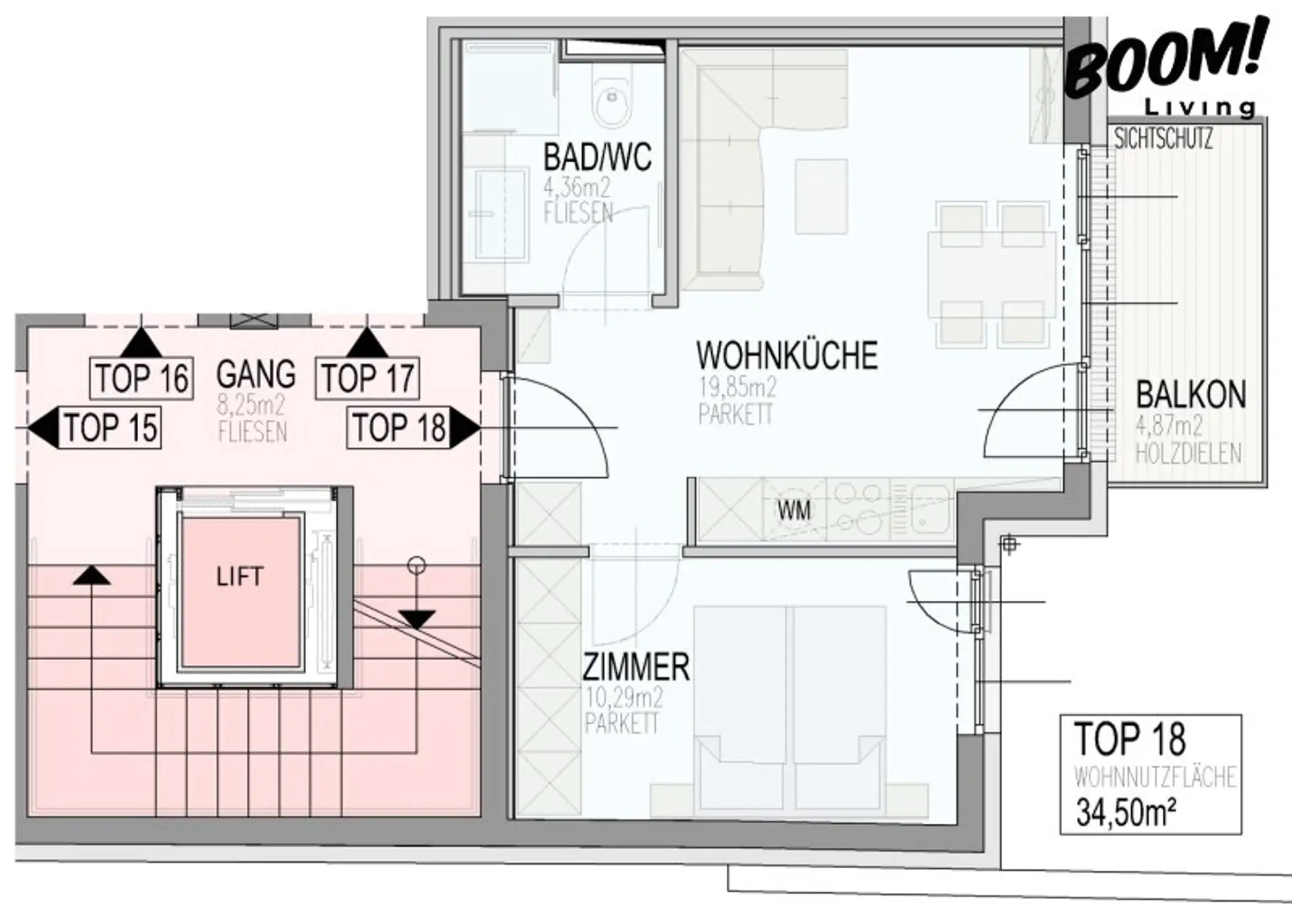 Ausgestattet mit Fußbodenheizung und -kühlung, betrieben über eine effiziente Luftwärmepumpe, bietet TOP 18 ganzjährig ein komfortables Wohnklima und niedrige Betriebskosten.