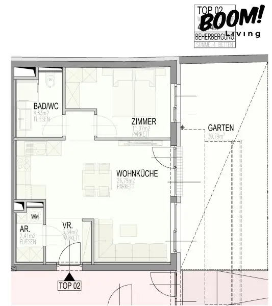 TOP 02 ist ein hochwertig ausgestattetes 2-Zimmer-Apartment mit 48,44 m² Wohnnutzfläche, die vielseitige Nutzungsmöglichkeiten eröffnet – ideal für Kurzzeitvermietung, Serviced Apartments oder als kompakte Stadtwohnung mit Investmentcharakter. Die Einheit befindet sich im Erdgeschoss des modernen Neubaus und bietet durch ihre Ausrichtung sowie den großzügigen Garten einen besonderen Mehrwert.