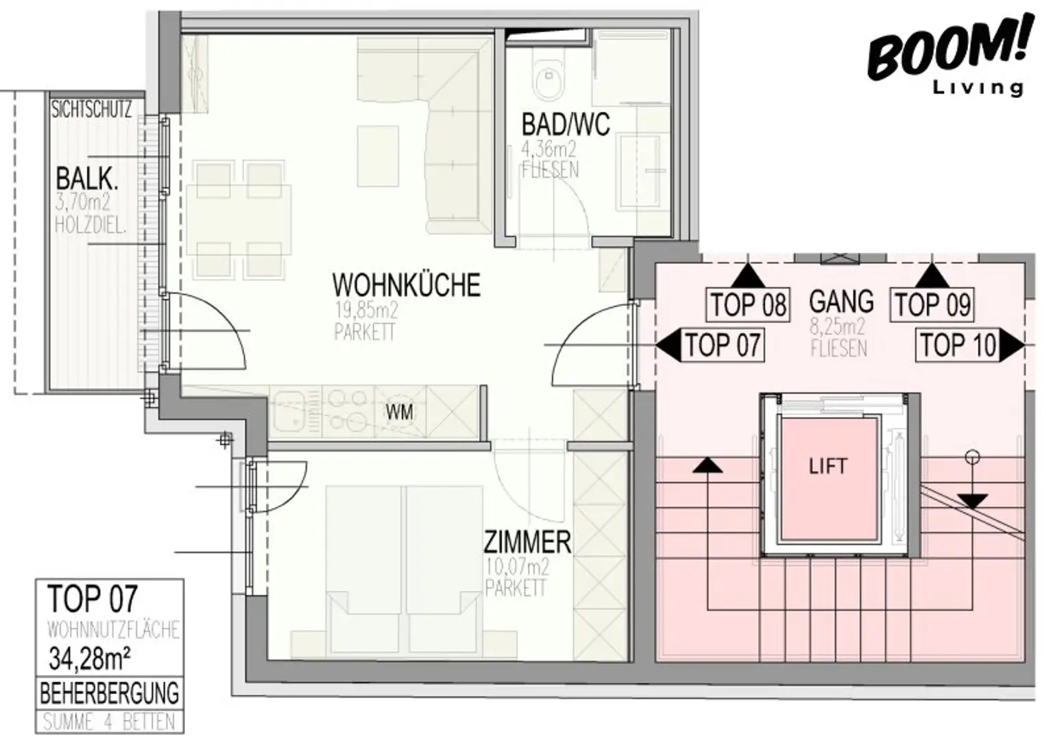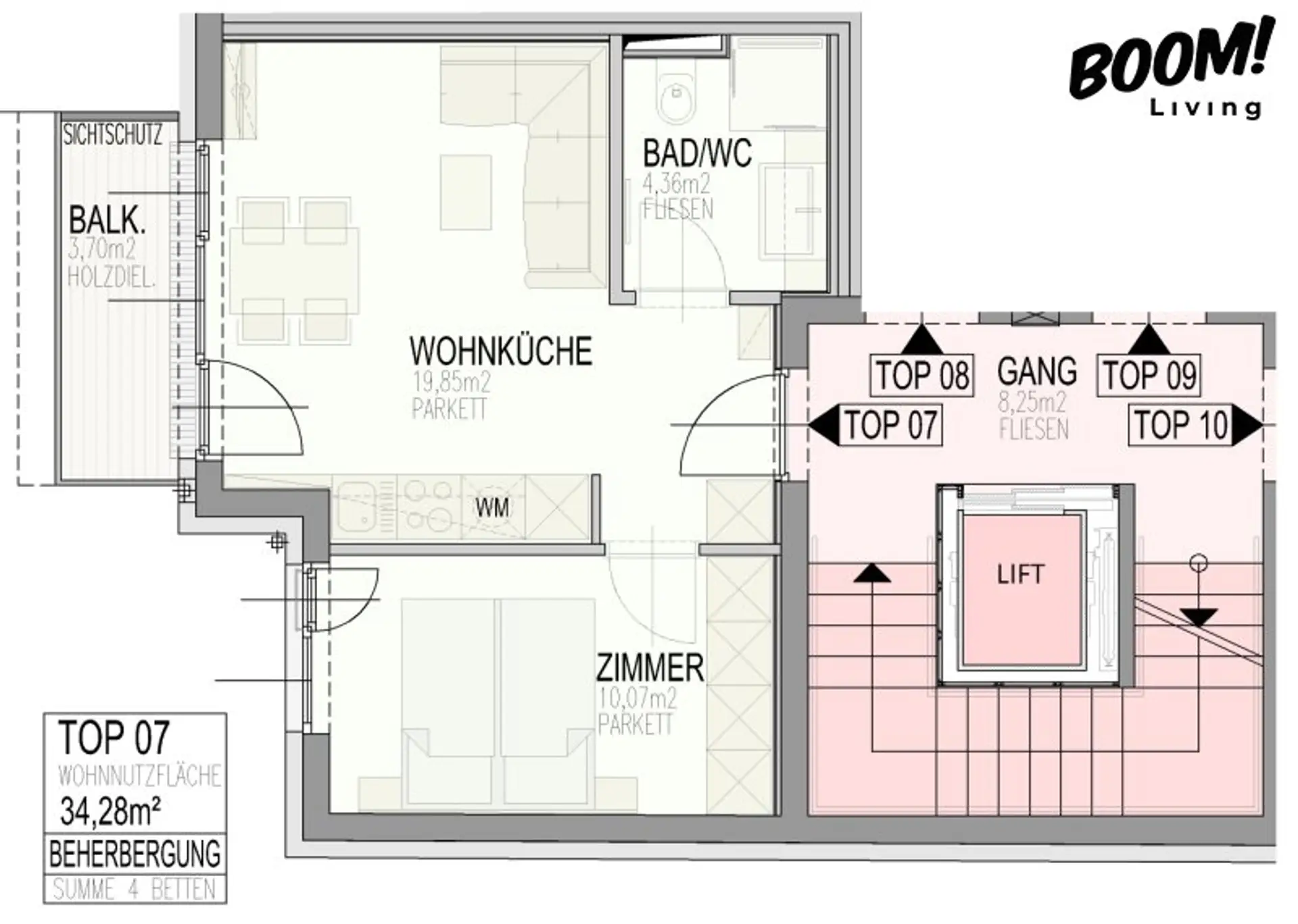 34,28 m² Wohnfläche + 3,70 m² Balkon