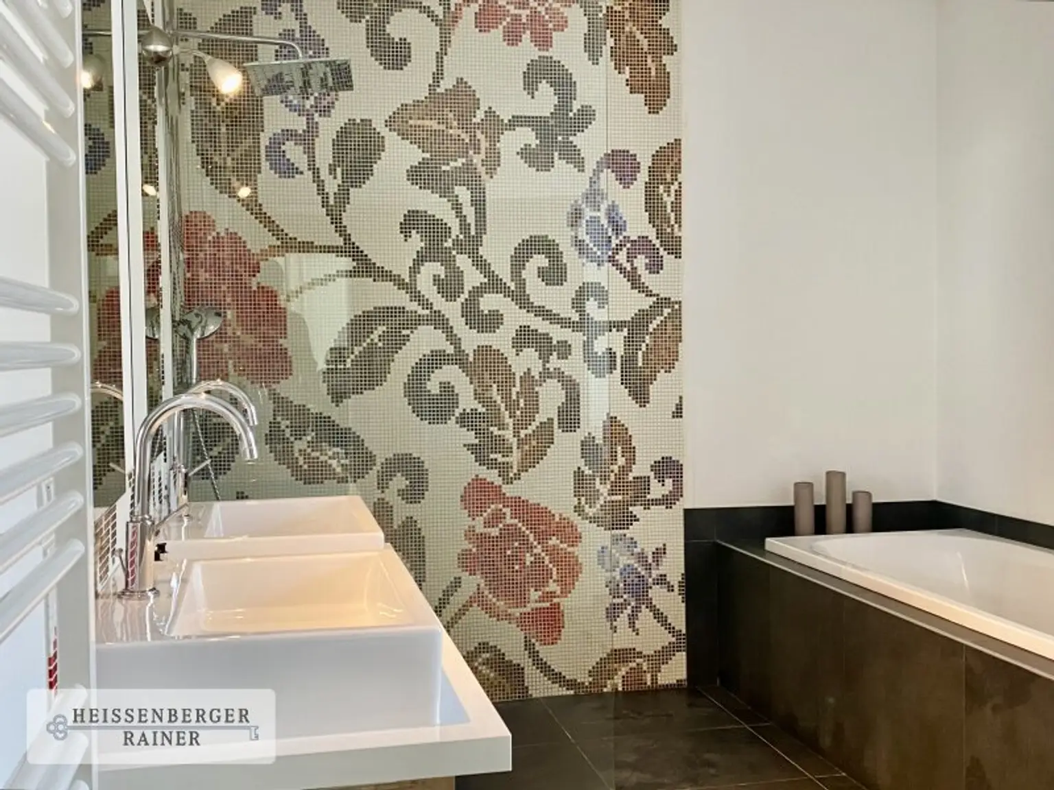 * Badezimmer mit Blick in den Garten, Badewanne und Dusche
