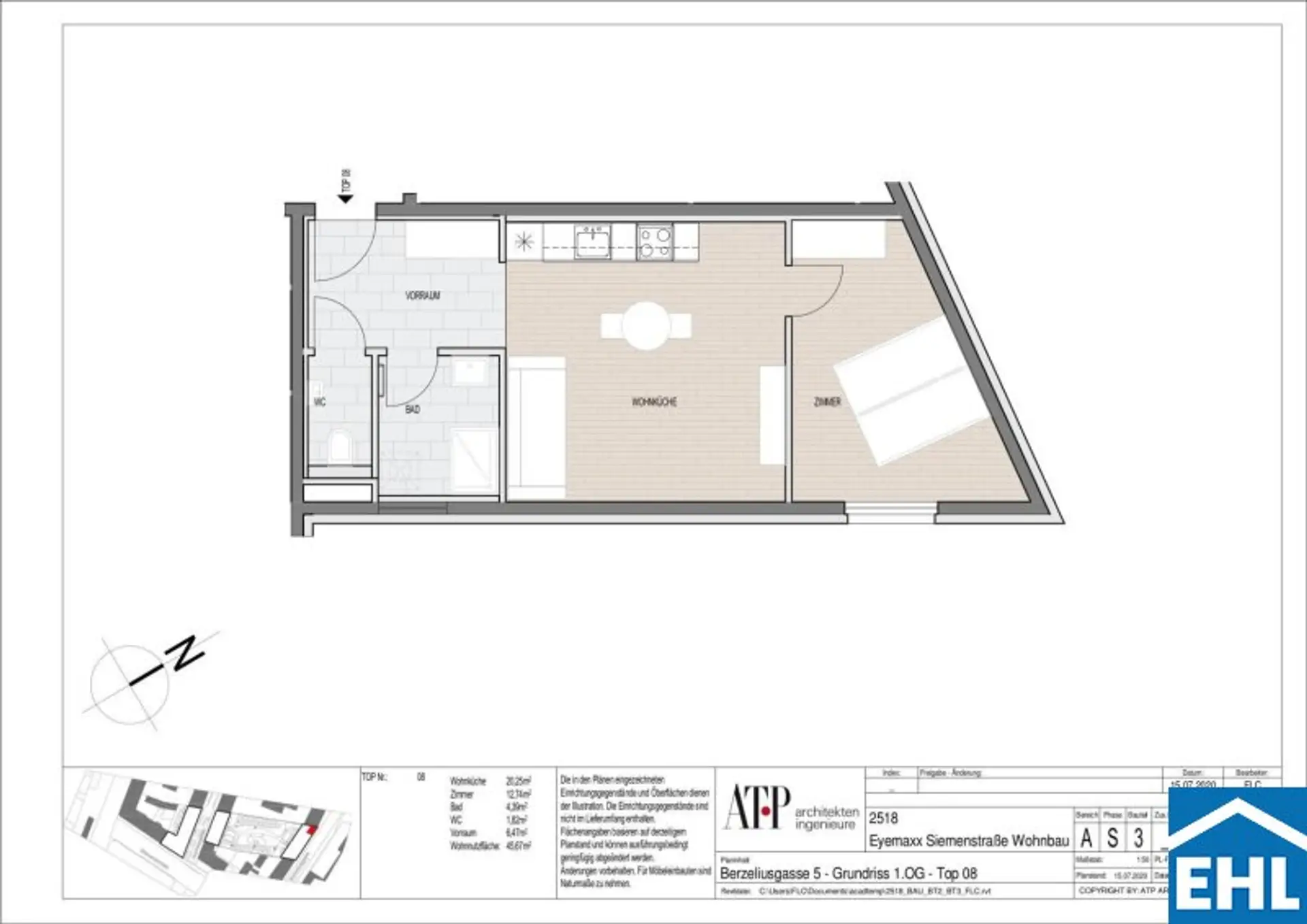 Die Wohnung selbst liegt im 1. OG und gliedert sich ein Wohnzimmer mit Küchenzeile, ein Schlafzimmer, ein Badezimmer mit Dusche, Waschmaschinenanschluss und Handwaschbecken sowie ein separates WC und ein Vorraum.