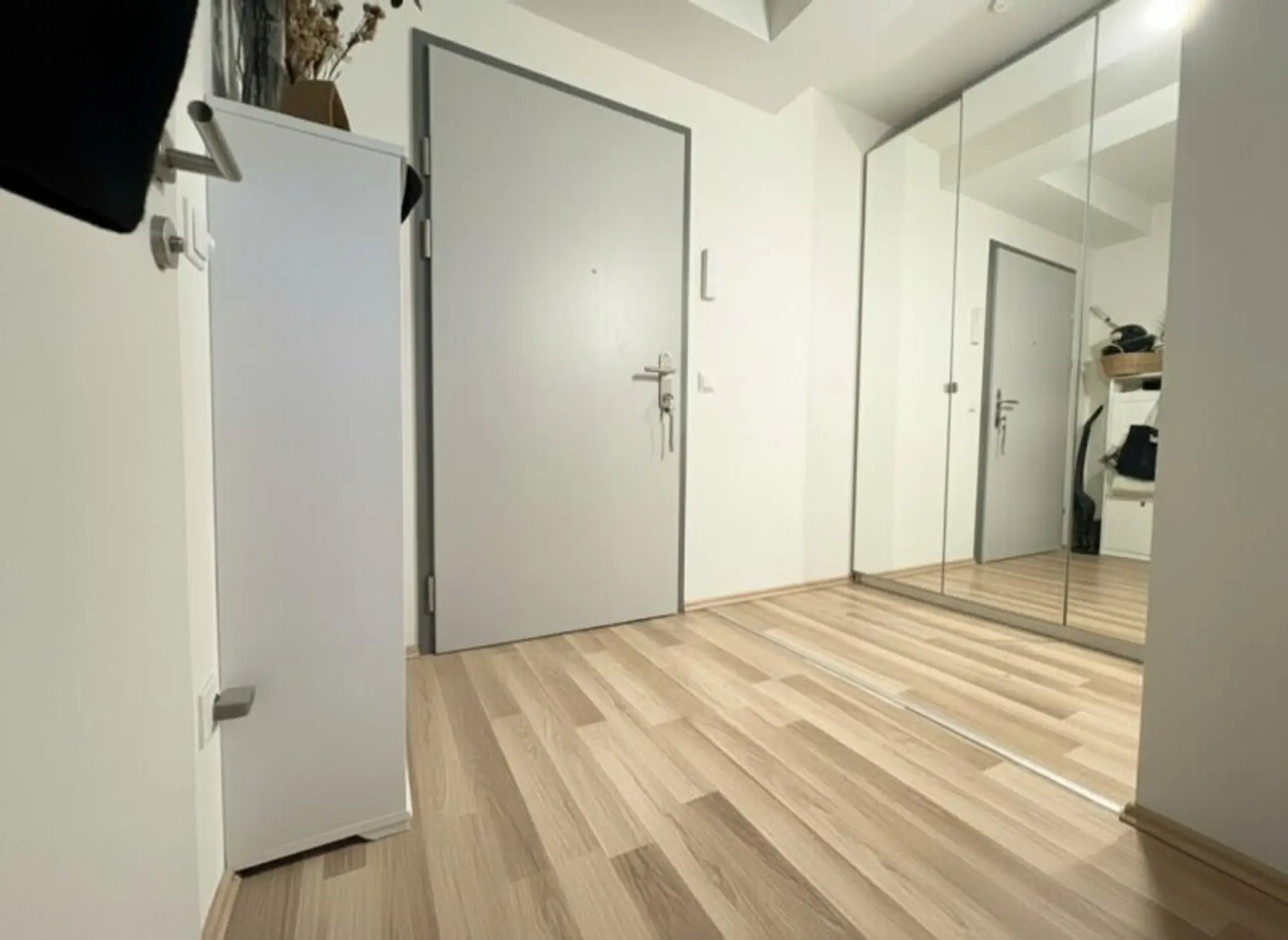 Das separate Schlafzimmer ist ruhig gelegen und gut proportioniert. Ein klar strukturierter Eingangsbereich sorgt für angenehme Raumtrennung und Stauraummöglichkeiten.
