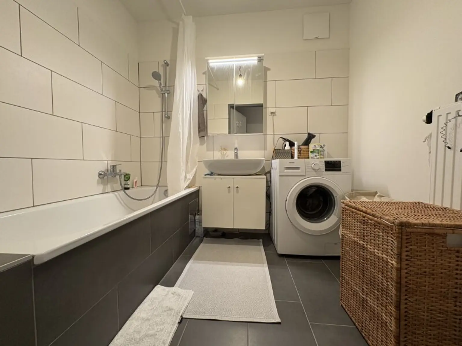 Das Badezimmer mit Badewanne lädt zum Entspannen ein, das WC ist separat ausgeführt – ein praktisches Detail für den Alltag.
