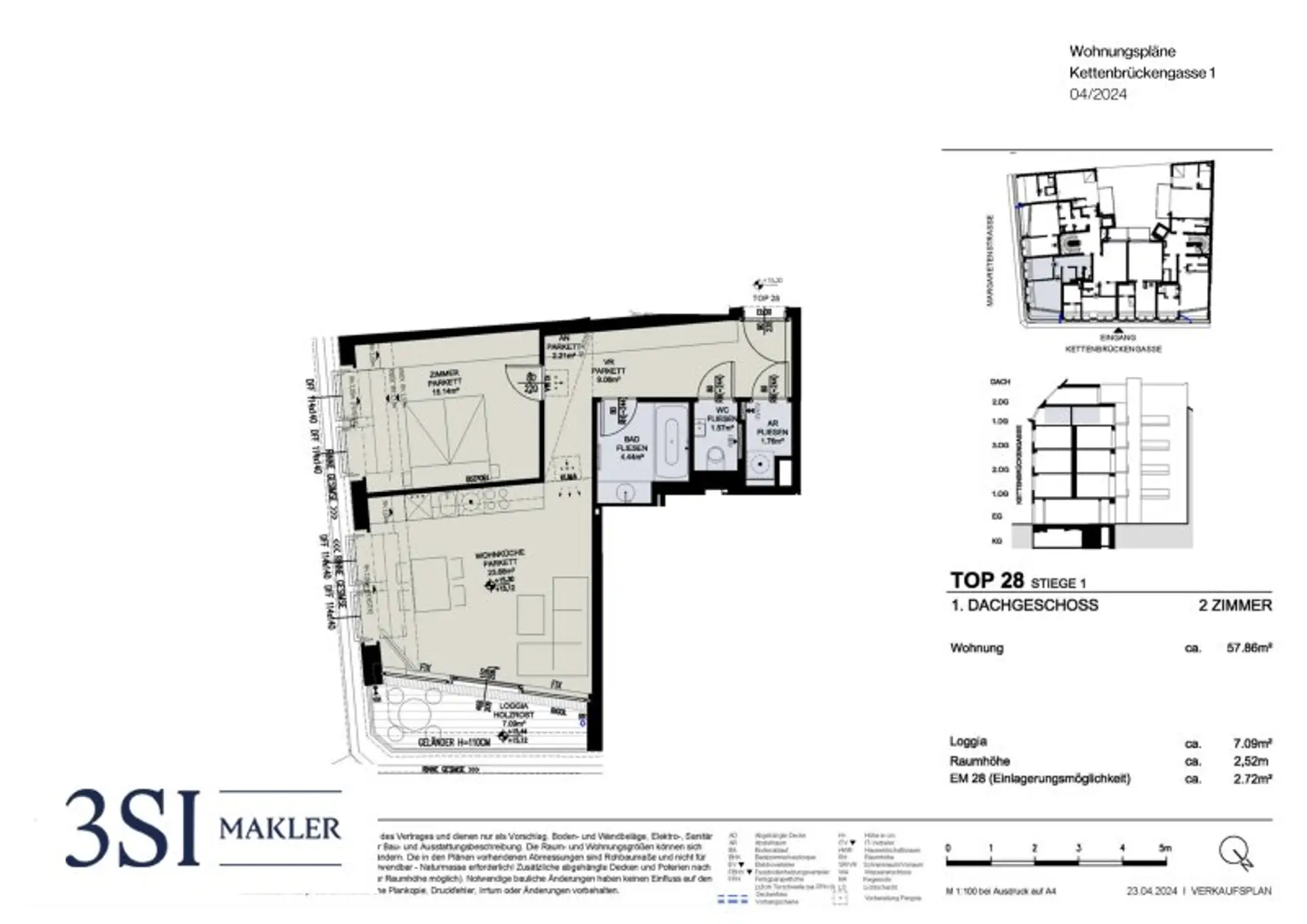 Die charmante 2-Zimmer-Wohnung befindet sich im 1. Dachgeschoss und bietet eine Wohnfläche von rund 58 m² sowie eine gemütliche Loggia mit etwa 7 m². Sämtliche Räume sind zentral begehbar und zeichnen sich durch eine durchdachte Raumaufteilung aus: