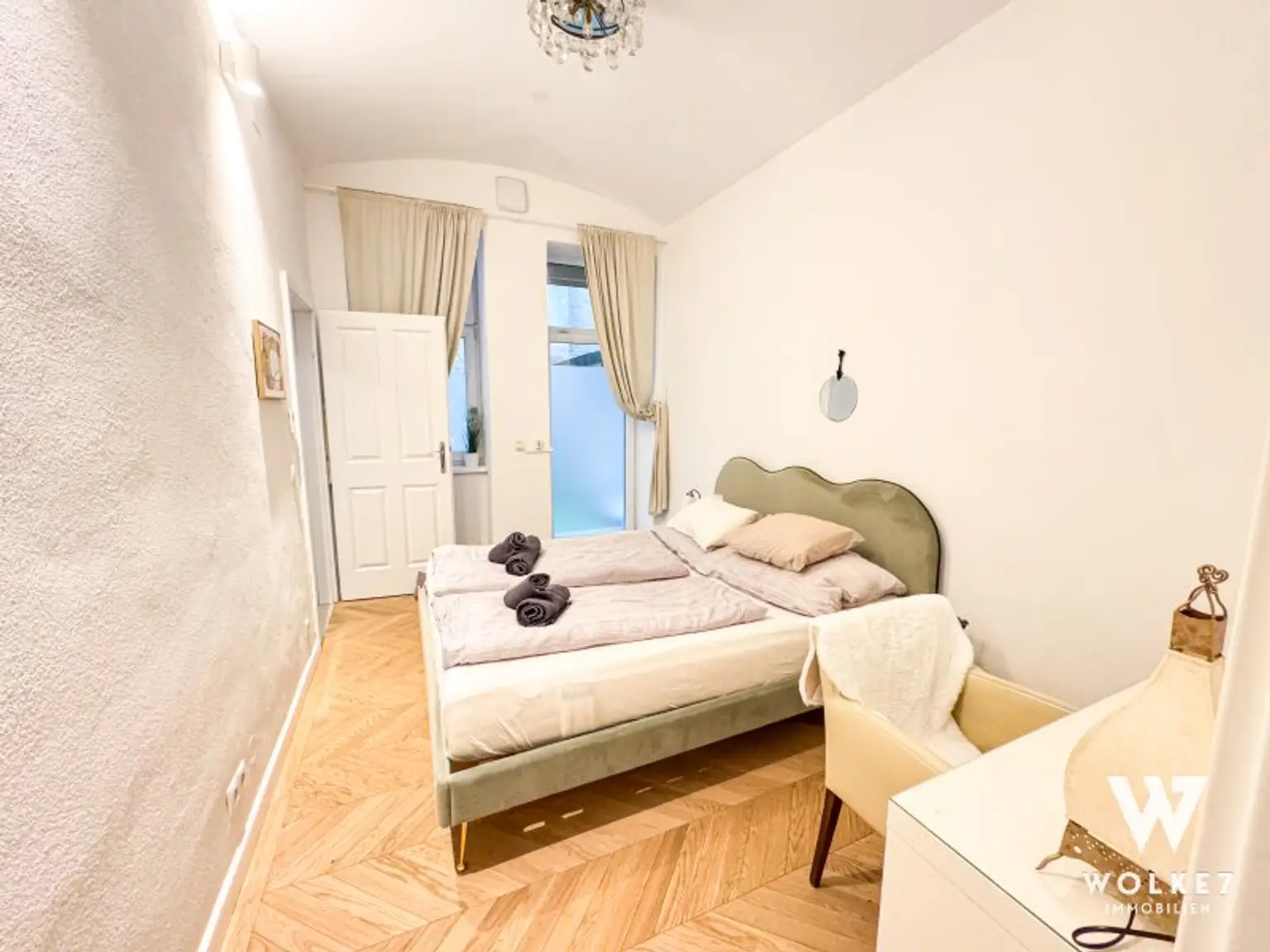 Das Schlafzimmer liegt ebenfalls zum ruhigen Innenhof und verfügt über einen begehbaren Schrankraum sowie einen direkten Zugang zur eigenen Terrasse – ein echtes Highlight der Wohnung.