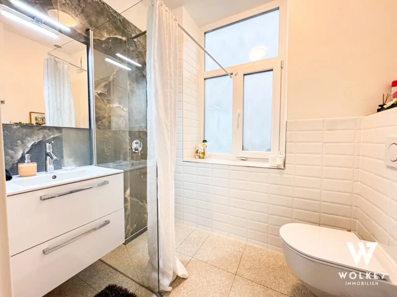Das komplett neu errichtete Badezimmer ist modern gestaltet und mit Dusche und WC ausgestattet. Zusätzlich sorgen Fußbodenheizung, Gas-Kombitherme sowie ein Kellerabteil für hohen Wohnkomfort.