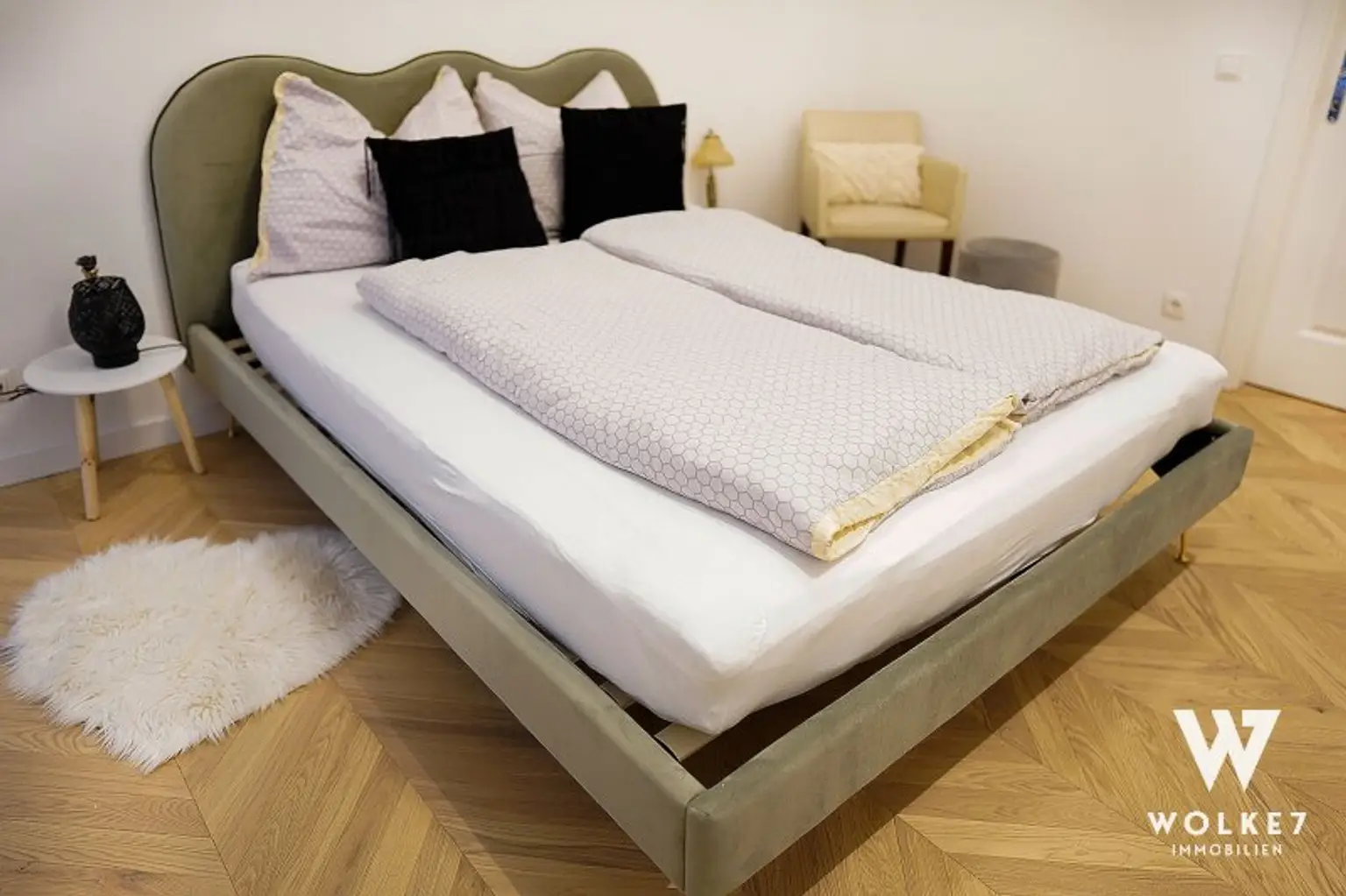 Das Schlafzimmer liegt ebenfalls zum ruhigen Innenhof und verfügt über einen begehbaren Schrankraum sowie einen direkten Zugang zur eigenen Terrasse – ein echtes Highlight der Wohnung.