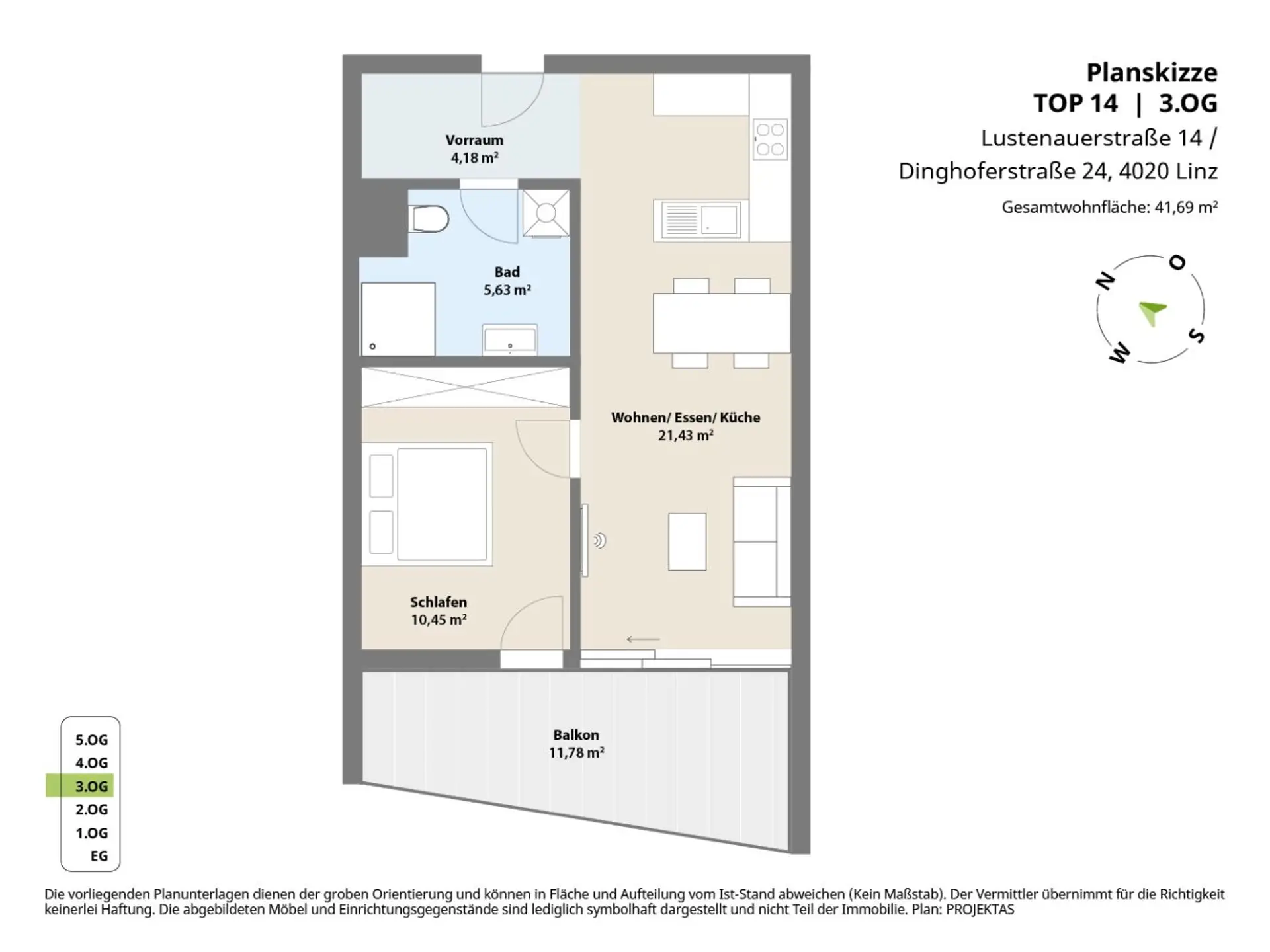 Raumaufteilung Top 14 im 3. OG (mit Lift):