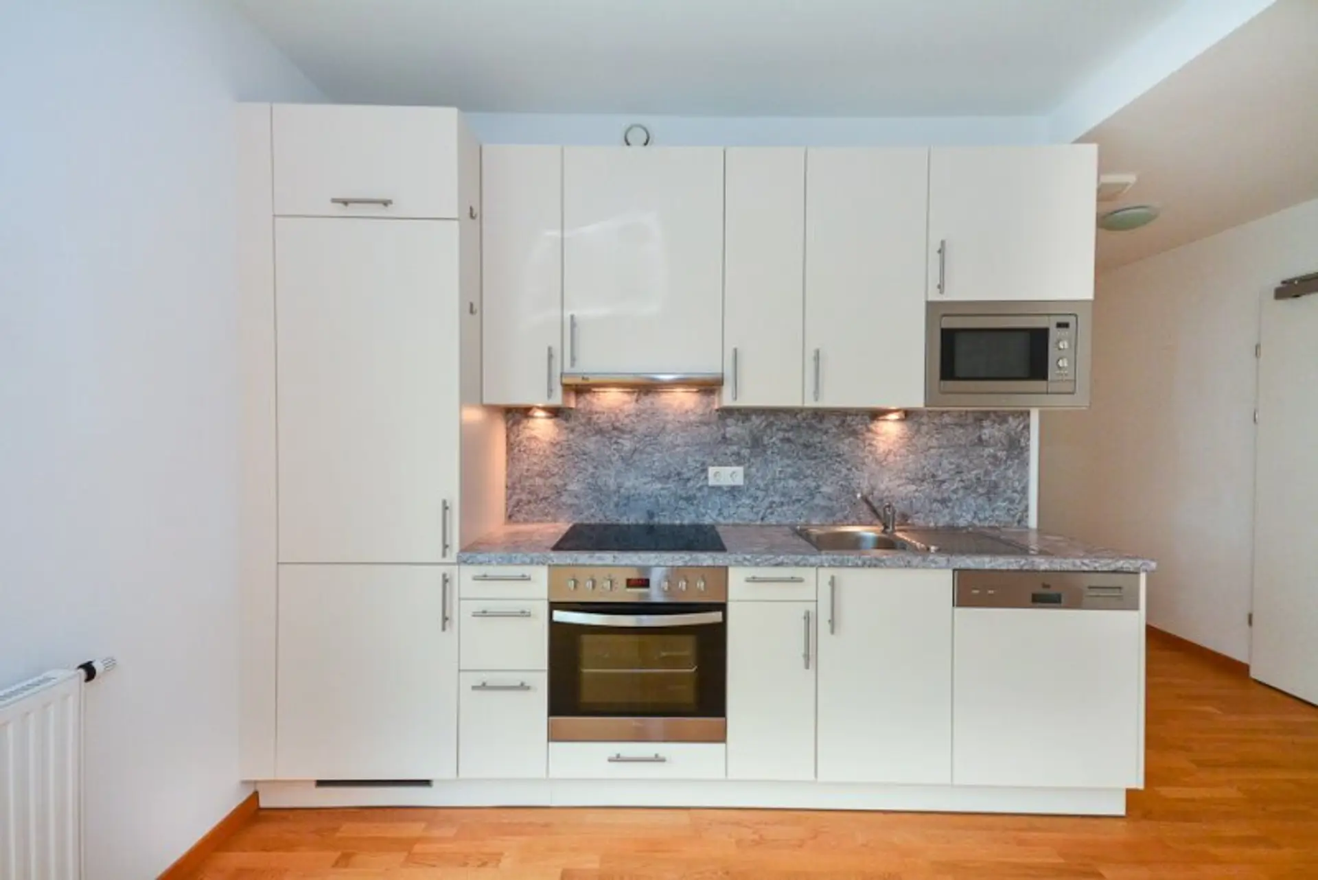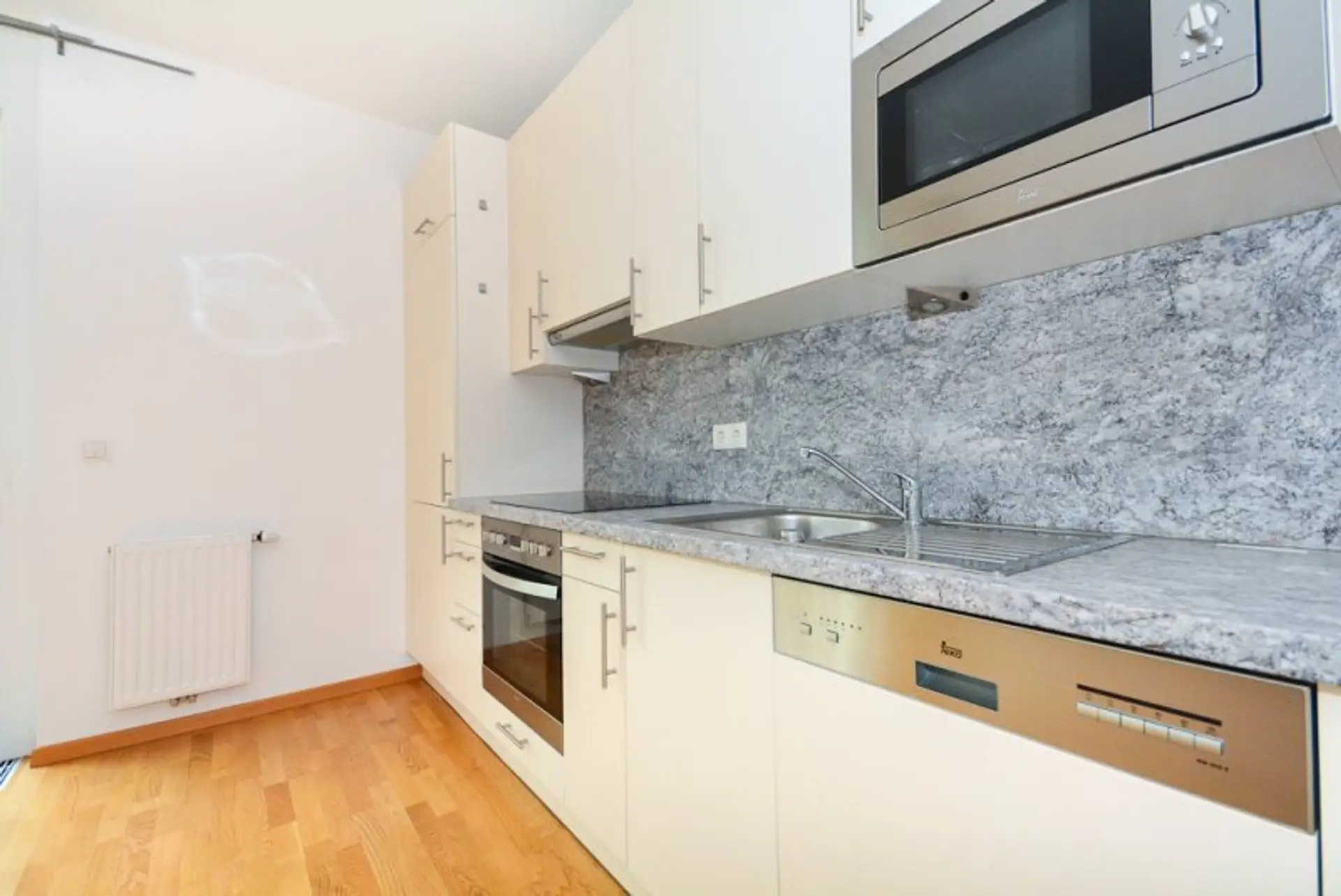 Die Wohnung befindets sich im 1. Liftstock und ist barrierefrei erreichbar. Sie zeichnet sich durch die zentrale Raumaufteilung aus und ist mit Parkettböden und Fliesen ausgestattet. Die Einbauküche ist noch neuwertig und mit Kühlschrank, Gefrierschrank, Mikrowelle, Herd und Geschirrspüler ausgestattet. Durch die großen Fensterflächen im Wohnbereich wirkt die Wohnung sehr hell und freundlich.