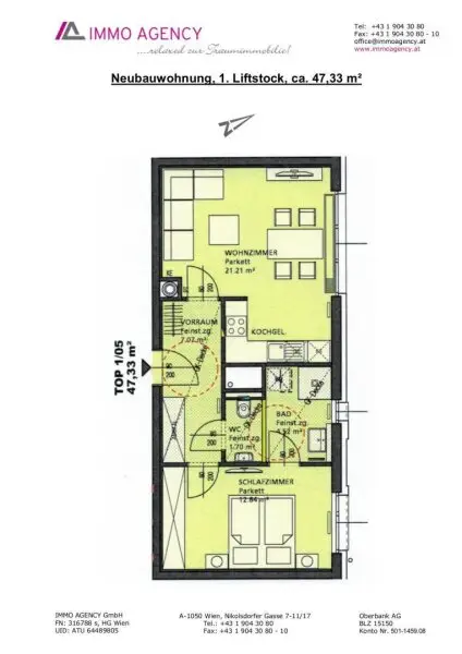 Über den Eingang gelangt man in den Vorraum/Garderobe von wo aus man in die Wohnküche, in das WC und in das Schlafzimmer gehen kann. Das Badezimmer mit Dusche (Waschmaschinenanschluss und Fenster vorhanden) sind vom Schlafzimmer aus begehbar.