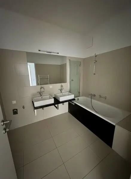 * Badezimmer mit Badewanne und Doppelwaschbecken