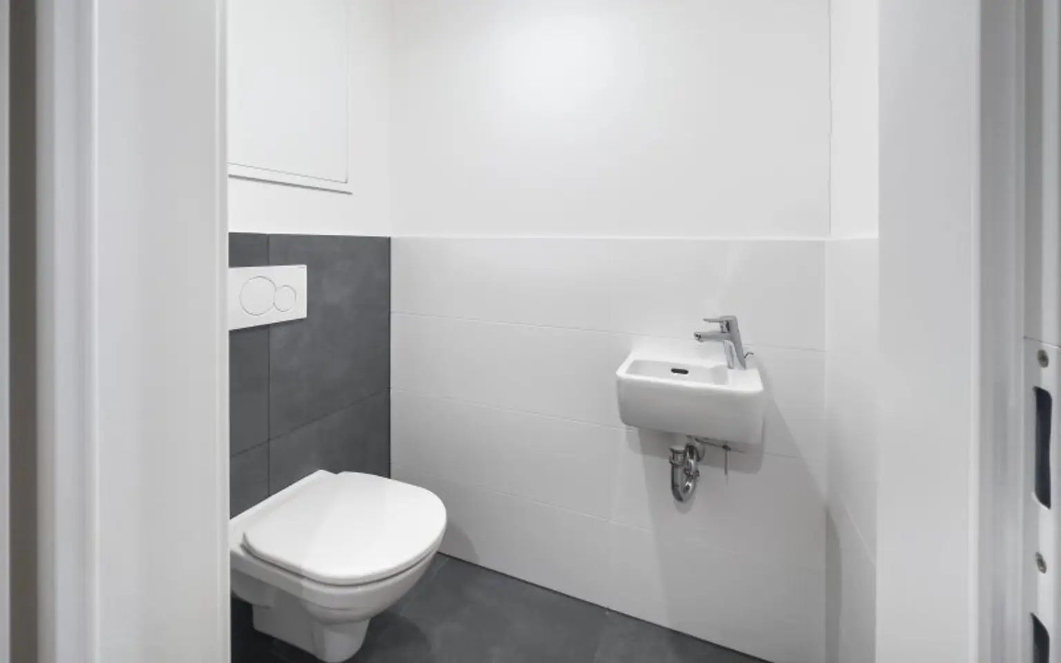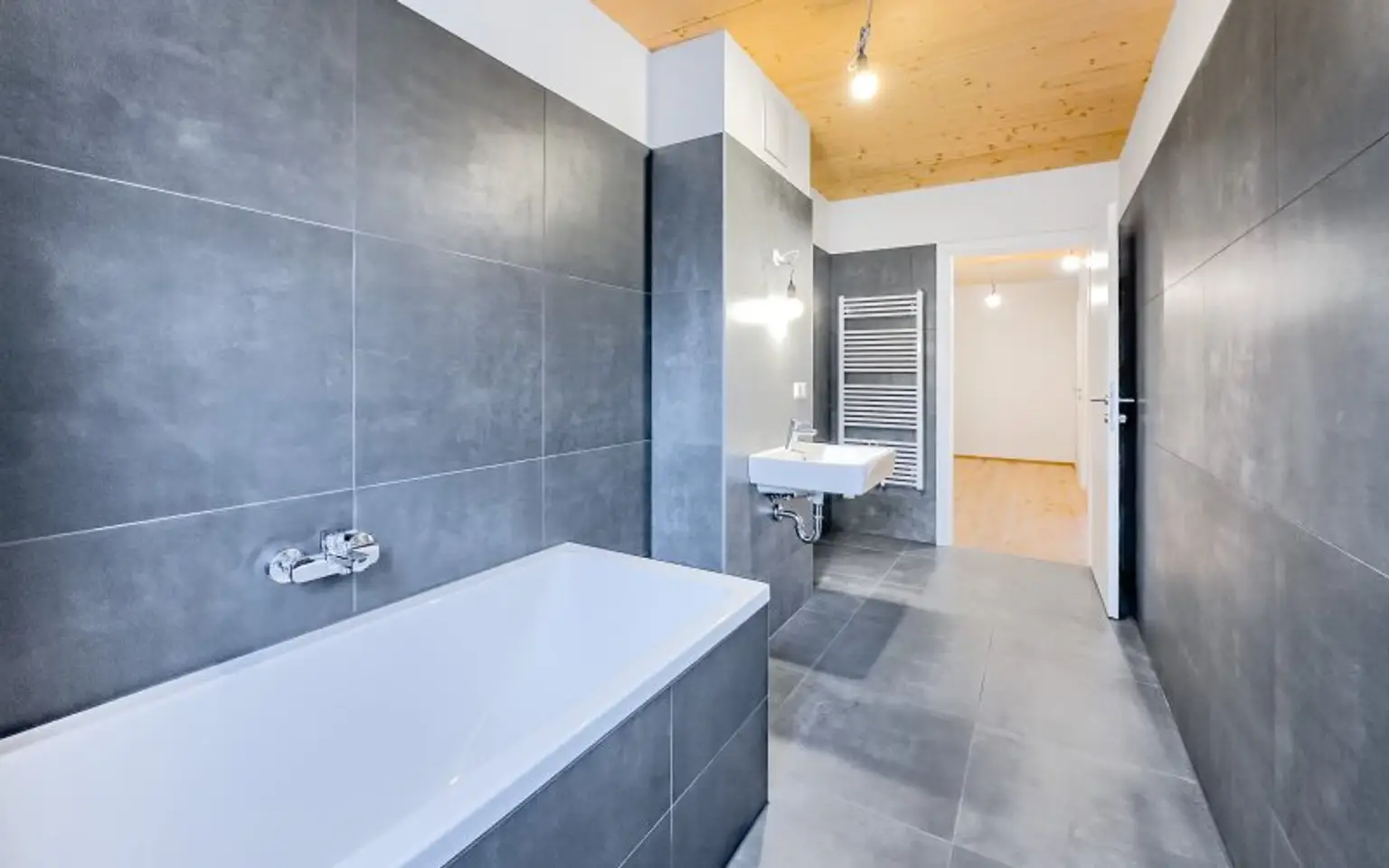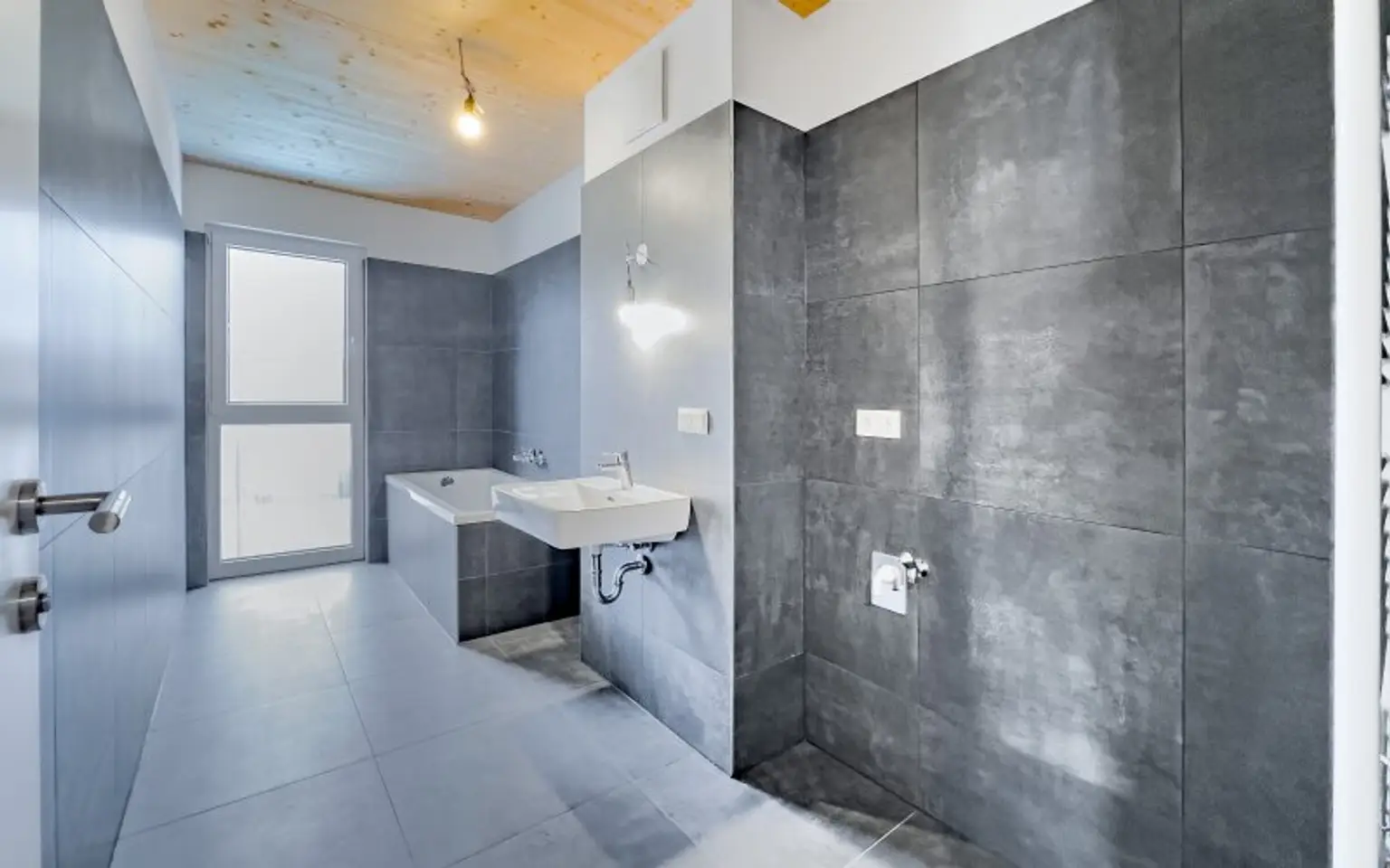 hochwertige Sanitärgegenstände und großformatiges Feinsteinzeug in den Sanitärräumen