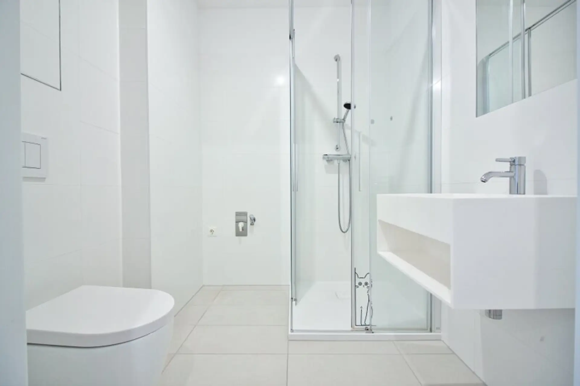 * Badezimmer mit Dusche, Waschbecken, Handtuchheizkörper, WC & Waschmaschinenanschluss