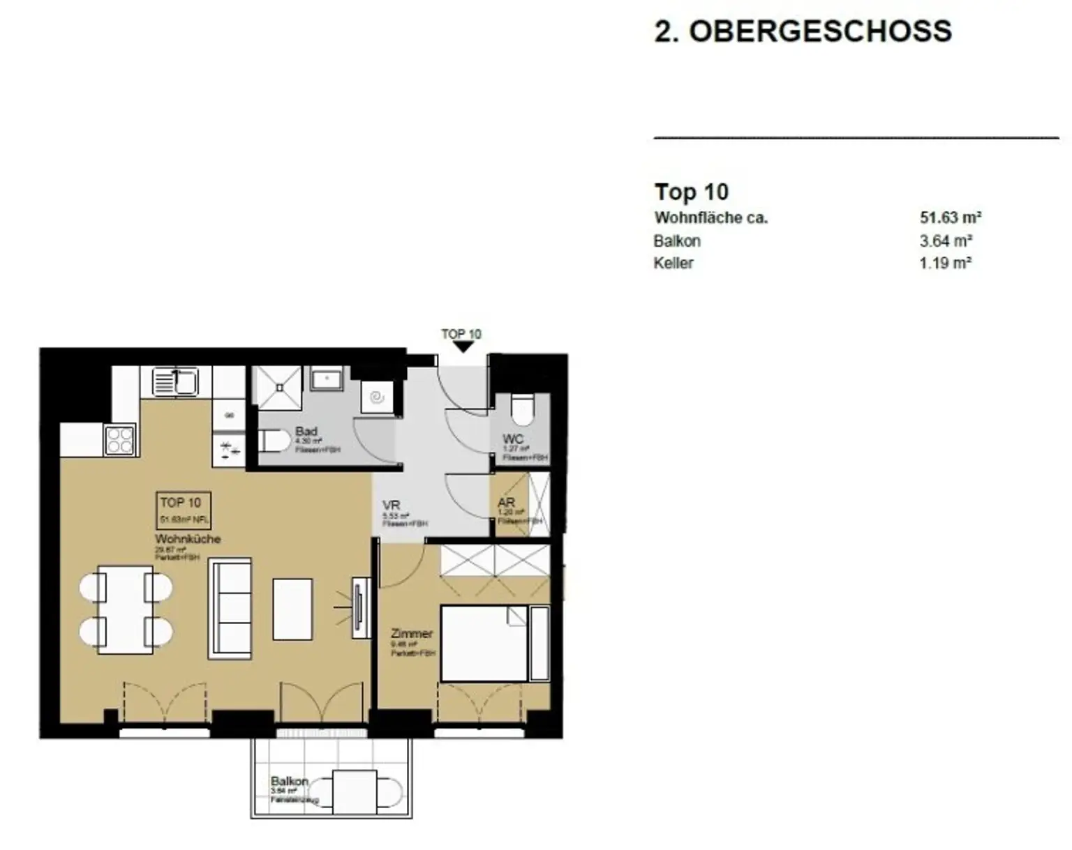 Die Wohnung befindet sich im 2. Liftstock eines im Jahre 1971 erbauten Neubaus und erstreckt sich über eine Wohnfläche von ca. 52 m². Sie teilt sich auf in einen Vorraum, eine Wohnküche, ein Schlafzimmer, ein Badezimmer, einen Abstellraum, einen Balkon sowie eine separate Toilette. Die Haupträume sind mit hochwertigem Parkett ausgekleidet, die Nassräume sind gefliest.