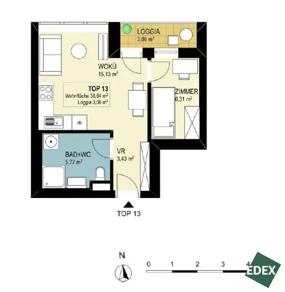 Die Wohnung verfügt über einen Vorraum (3,43 m²), ein Badezimmer mit WC und Waschmaschinenanschluss, eine großzügige Wohnküche (15,13 m²) sowie ein separates Zimmer (6,31 m²).
