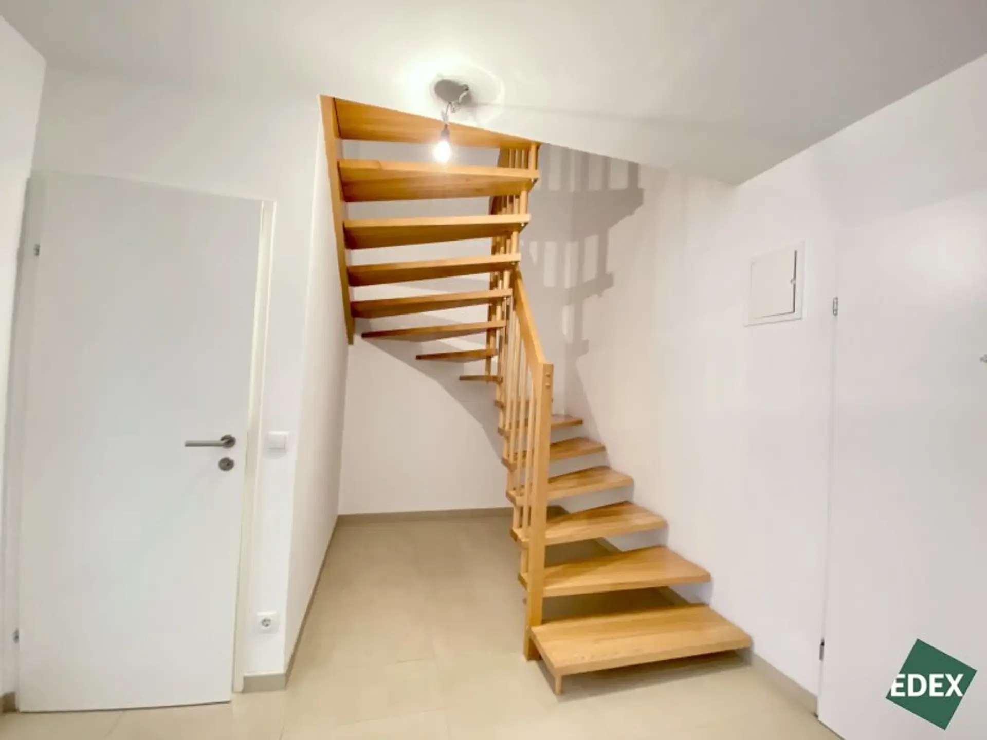 Auf der unteren Ebene erwarten Sie ein zentraler Vorraum, ein großzügiges Wohnzimmer mit Zugang zum ca. 6,3 m² großen Westbalkon, eine separate, moderne Wohnküche sowie ein WC. Eine elegante Holztreppe führt in die obere Ebene, wo sich zwei weitere Zimmer, ein Badezimmer mit Badewanne, Waschmaschinenanschluss und Waschbecken sowie ein praktischer Flur mit Platz für Stauraum befinden.