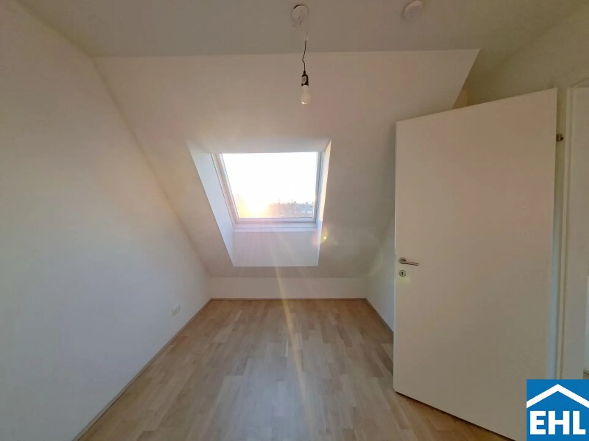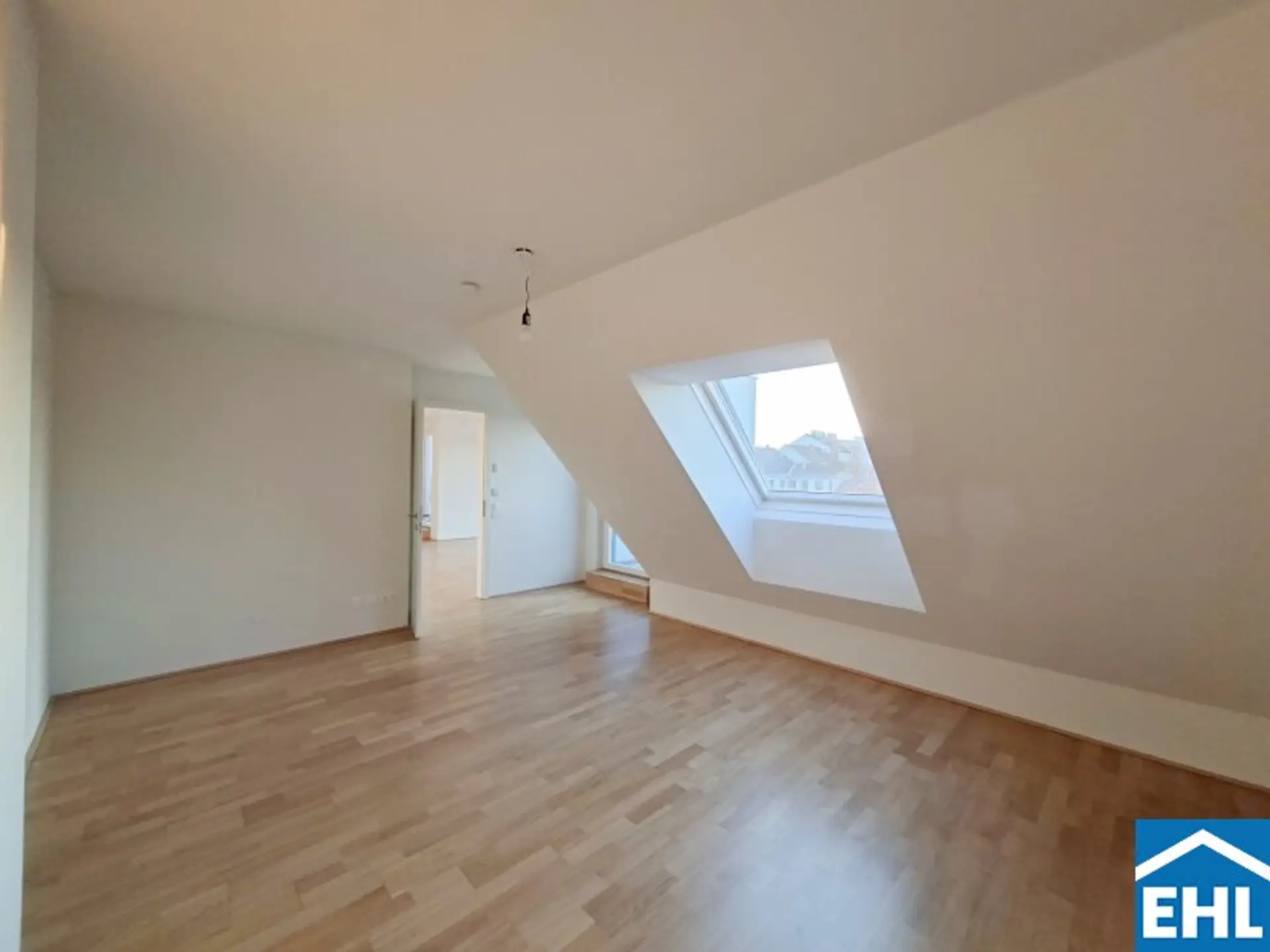 Die Wohnung selbst befindet sich im 1. Dachgeschoß und verfügt über eine Wohnküche, zwei Schlafzimmer, ein Badezimmer mit Dusche, WC und Waschmaschinenanschluss, ein separates WC, sowie einen Vorraum. Zwei Balkone runden das Wohnerlebnis ab.