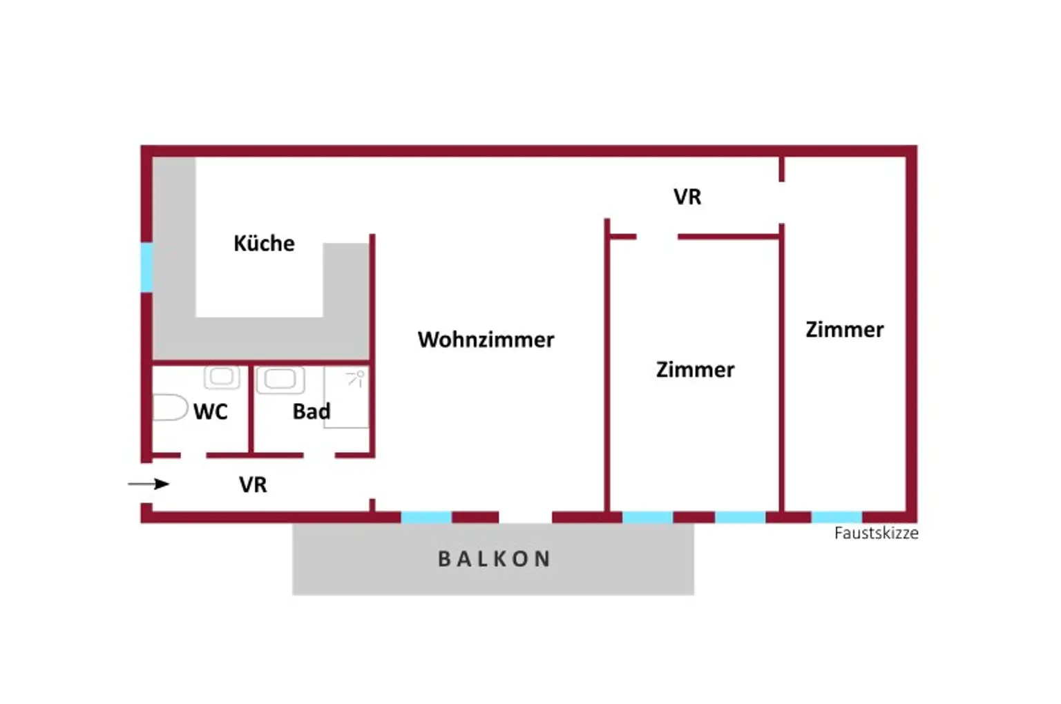 Vorraum, Wohnzimmer/Küche mit Zugang zum Balkon, Schlafzimmer 1, Schlafzimmer 2, Bad mit Dusche, Toilette.