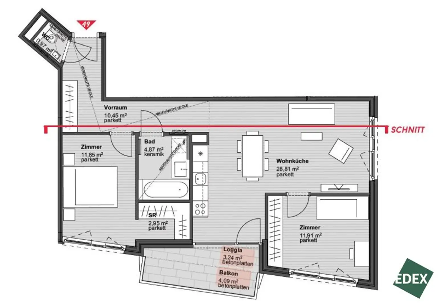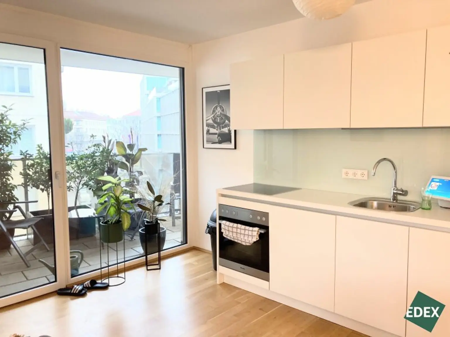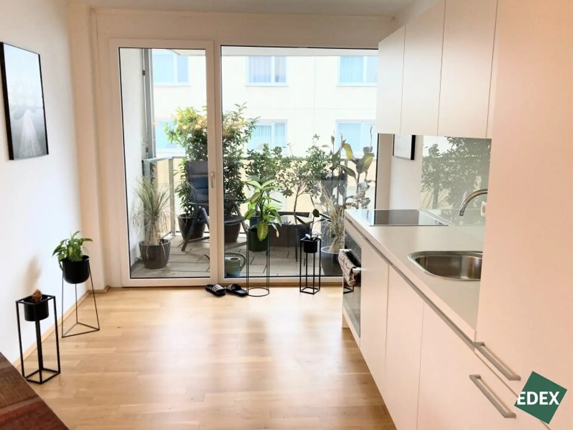 Herzstück der Wohnung ist die großzügige Wohnküche mit ca. 29 m², die über eine moderne Einbauküche mit hochwertigen Geräten verfügt. Der direkt angeschlossene Balkon (ca. 7 m²) lädt zu sonnigen Stunden und lauen Abenden im Freien ein.