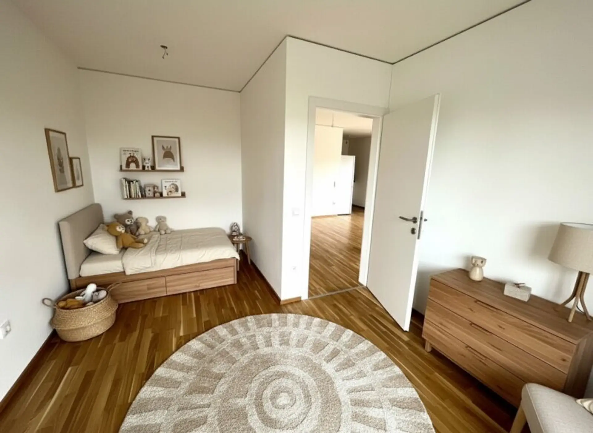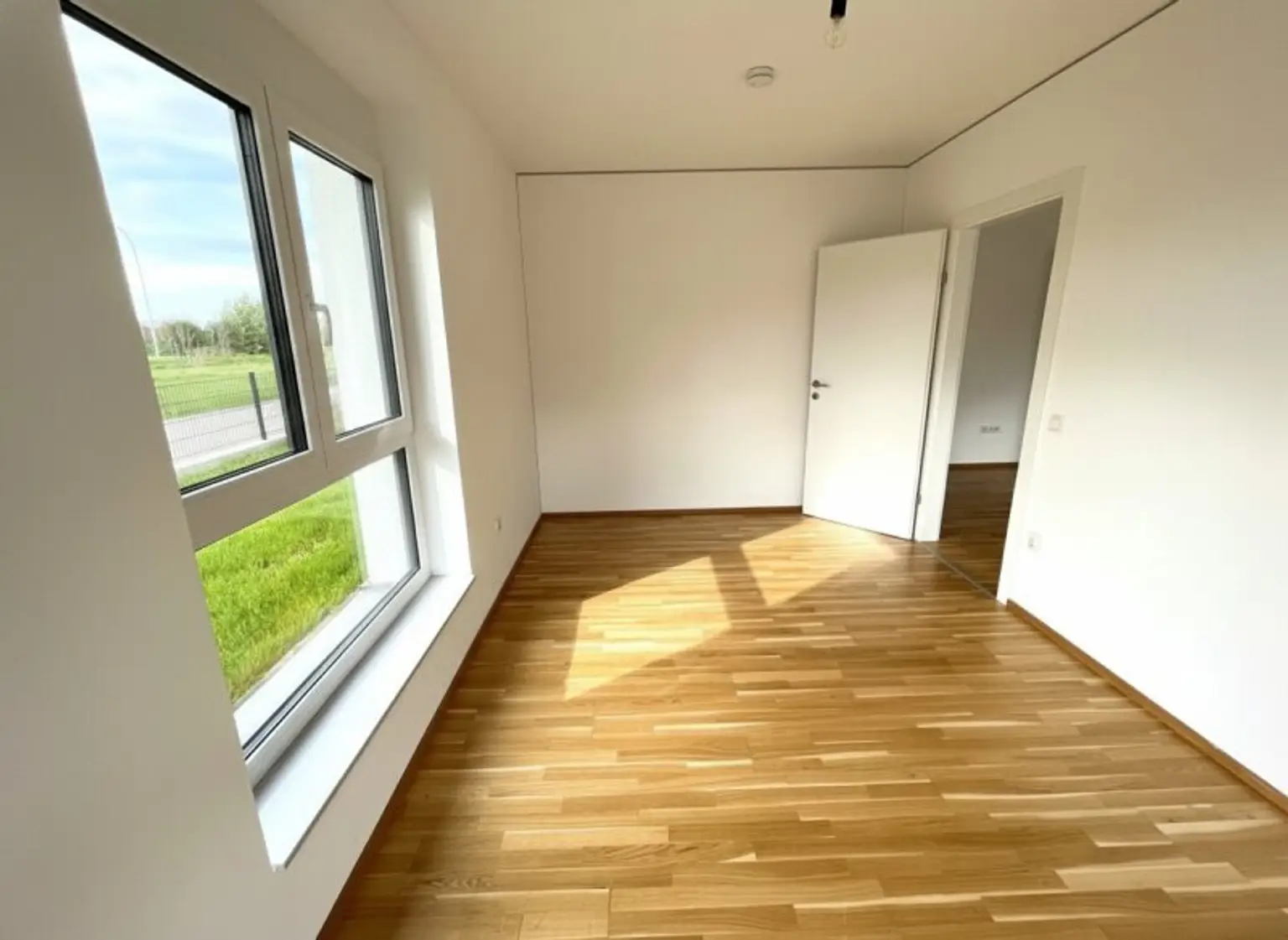 Die schicke 3-Zimmerwohnung im Erdgeschoss betritt man durch den gepflegten Eingangsbereich, welcher ausreichend Platz für eine Garderobe sowie den zentralen Zugang zu allen Räumlichkeiten der Wohnung bietet. Unmittelbar rechts vom Eingangsbereich befindet sich das Badezimmer mit Duschbadewanne und ein separates WC. Beide Nassräume sind durchgehend mit modernen Fliesen ausgestattet. Ein Abstellraum schafft Stauraum für nützliche Alltagsgegenstände. Die beiden Schlafräume sind ca. gleich groß, wobei sich als Master-Bedroom das rechte auszeichnet, da es eine Spur größer ist. Der zweite Schlafraum bietet sich idealerweise als Büro an, z.B. um Homeoffice zu betreiben. Der Wohn- Essbereich ist mit einer Einbauküche sowie modernen Gerätschaften ausgestattet. Die großen Fenster sorgen für viel Licht im Wohnraum, der helle Parkett lässt den Raum offen und freundlich wirken. Die sonnige, idyllische Terrasse gewährt mitsamt einer Gartenfläche von 45,00m² Ruhe und Erholung und hat eine angenehme Größe für einen geselligen Grillabend.