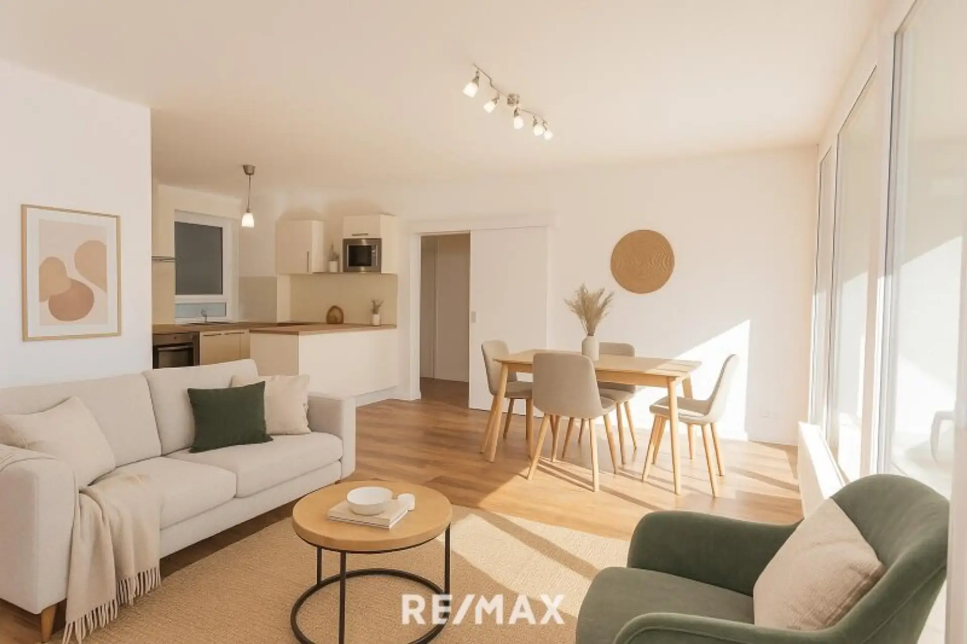 Wohn-/Essbereich mit offener Küche – ca. 28,0 m², Ausgang auf die Loggia