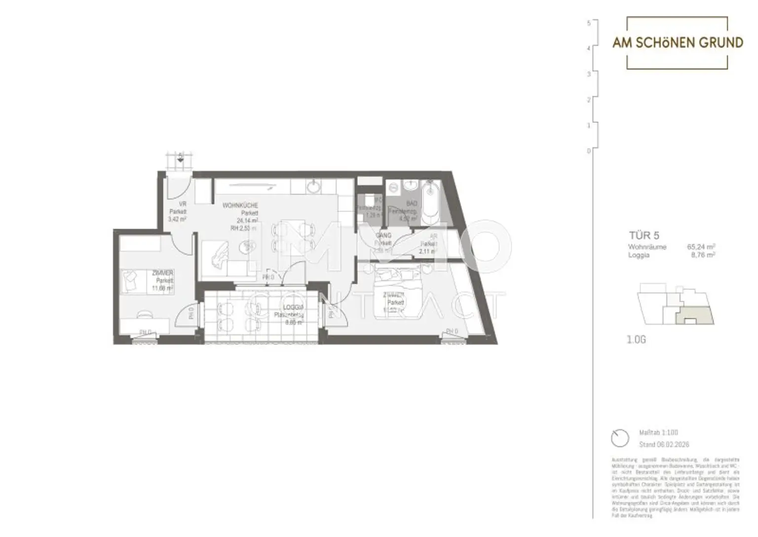 Diese moderne 3-Zimmer-Wohnung im 1. Obergeschoß überzeugt durch einen offenen Wohn-/Essbereich sowie zwei getrennt begehbare Schlafzimmer. Die großzügige Loggia ist von allen drei Zimmern direkt zugänglich. Neben dem Badezimmer mit Badewanne stehen ein separates WC sowie ein praktischer Abstellraum zur Verfügung – funktional angeordnet und ideal für Familien, Paare oder als Investment.