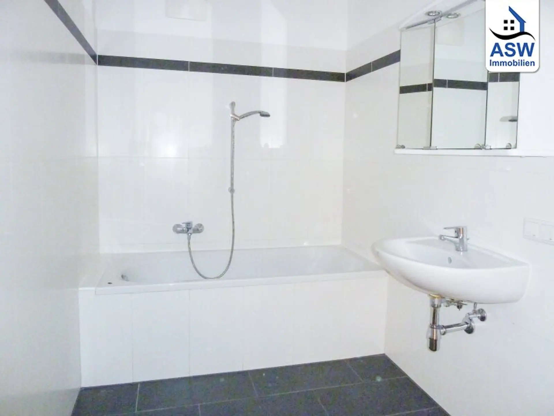 - Badezimmer mit Badewanne und Waschmaschinenanschluss