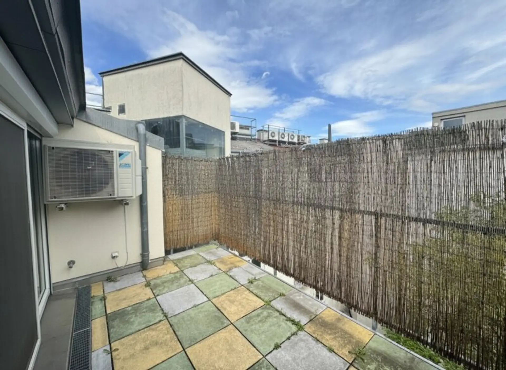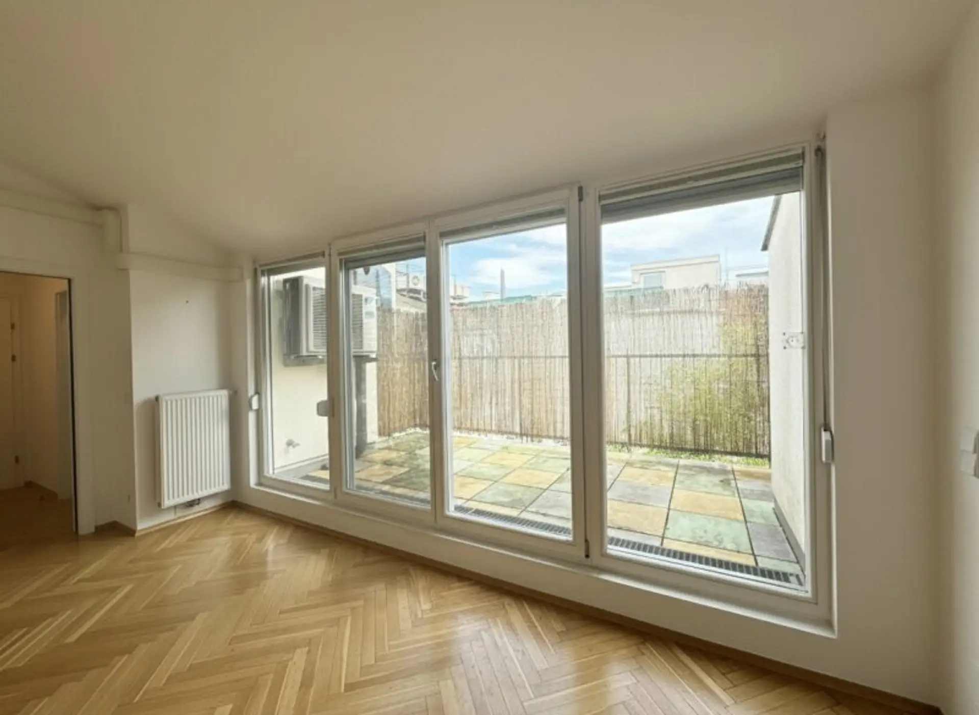 Die rund 14 m² große Terrasse ist zum ruhigen Innenhof ausgerichtet und stellt einen angenehmen Rückzugsort im Freien dar.