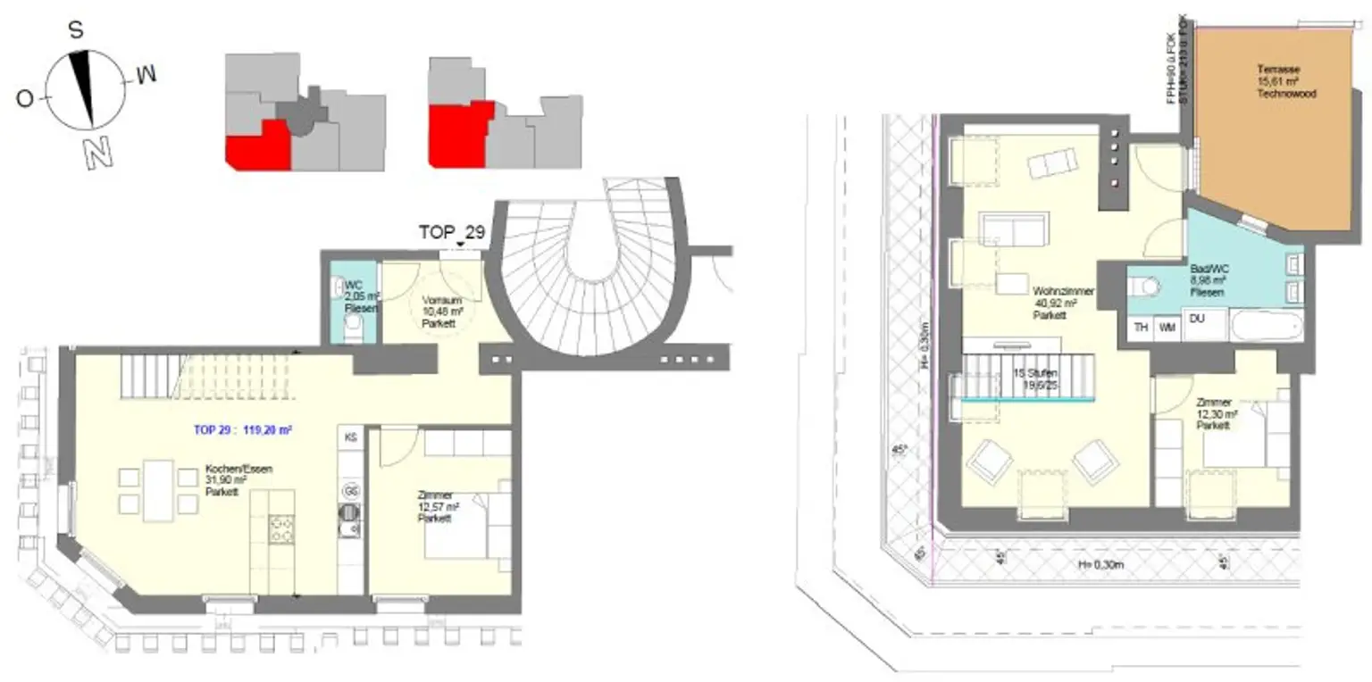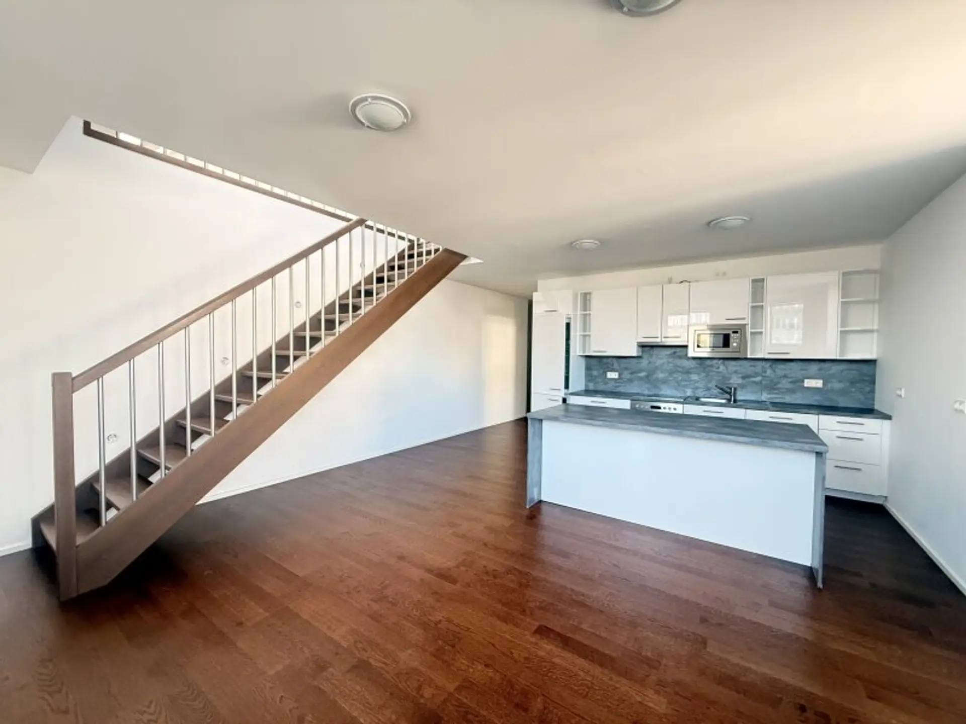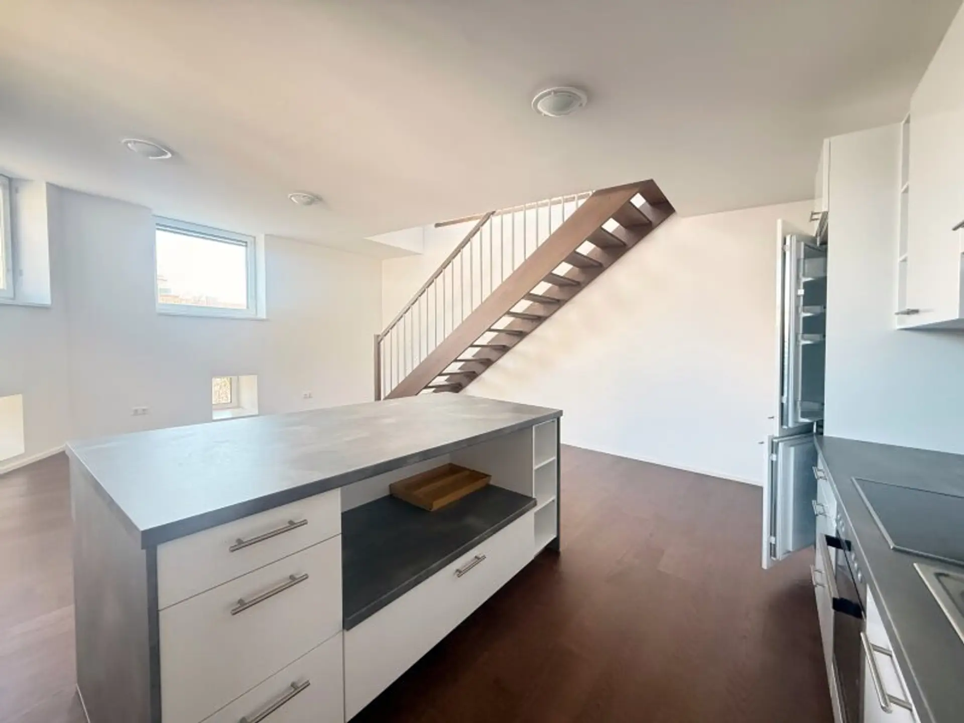 Die Maisonette-Wohnung erstreckt sich über zwei Ebenen: Im unteren Geschoss befinden sich ein Wohnbereich mit Küche, ein Schlafzimmer sowie ein WC. Das obere Geschoss bietet ein weiteres, kleineres Schlafzimmer, eine großzügige Galerie bzw. Wohnbereich sowie ein Badezimmer mit Dusche und WC. Die sonnige, ruhig zum Innenhof ausgerichtete Terrasse ist direkt vom Obergeschoss zugänglich. Große Fensterflächen und Dachfenster sorgen für ein helles Wohnambiente, während die Galerie flexibel als Wohn-, Arbeits- oder Loungebereich genutzt werden kann.