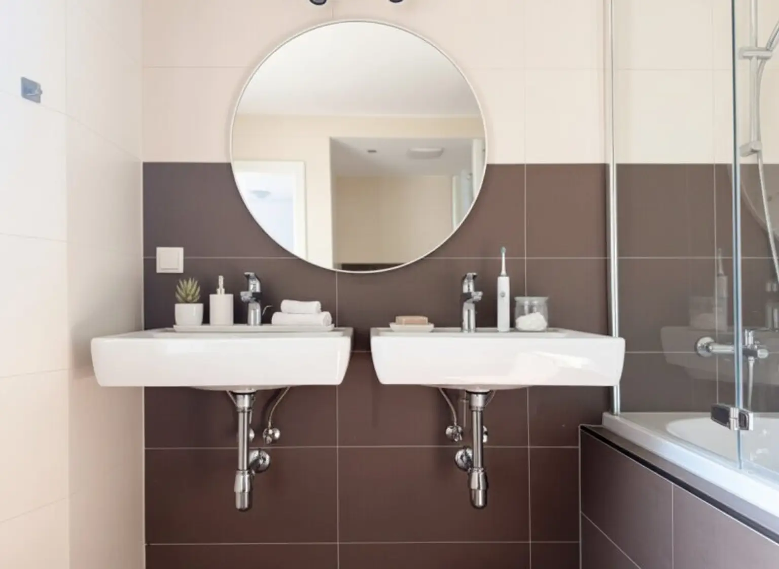 * Tageslichtbad mit Badewanne, Dusche und Doppelwaschbecken (Laufen)