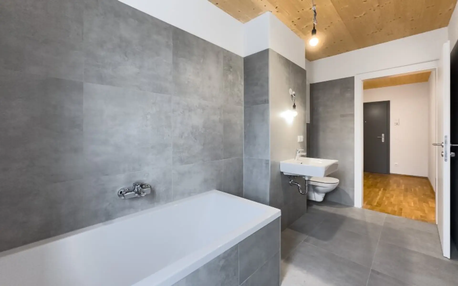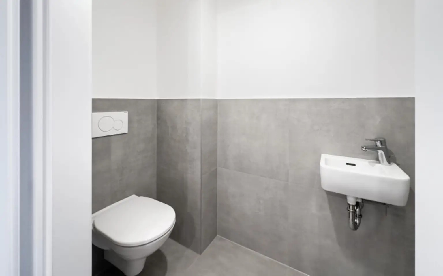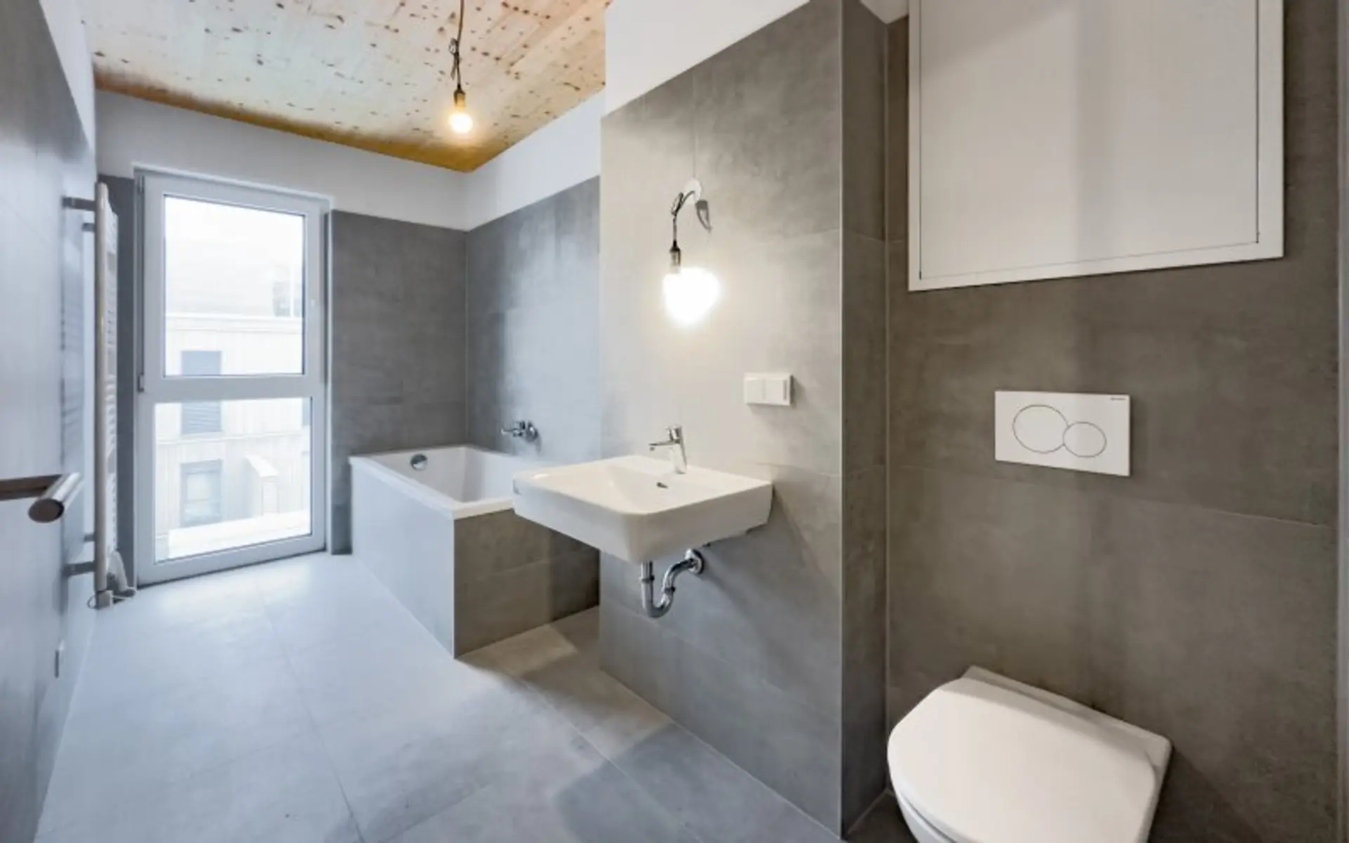 hochwertige Sanitärgegenstände und großformatiges Feinsteinzeug in den Sanitärräumen
