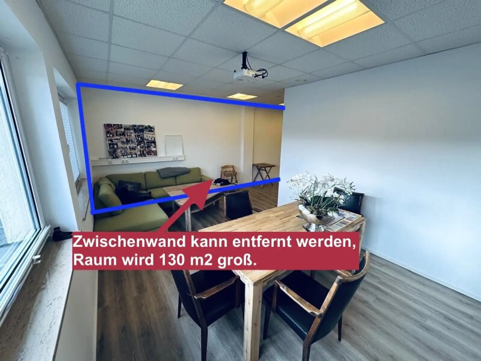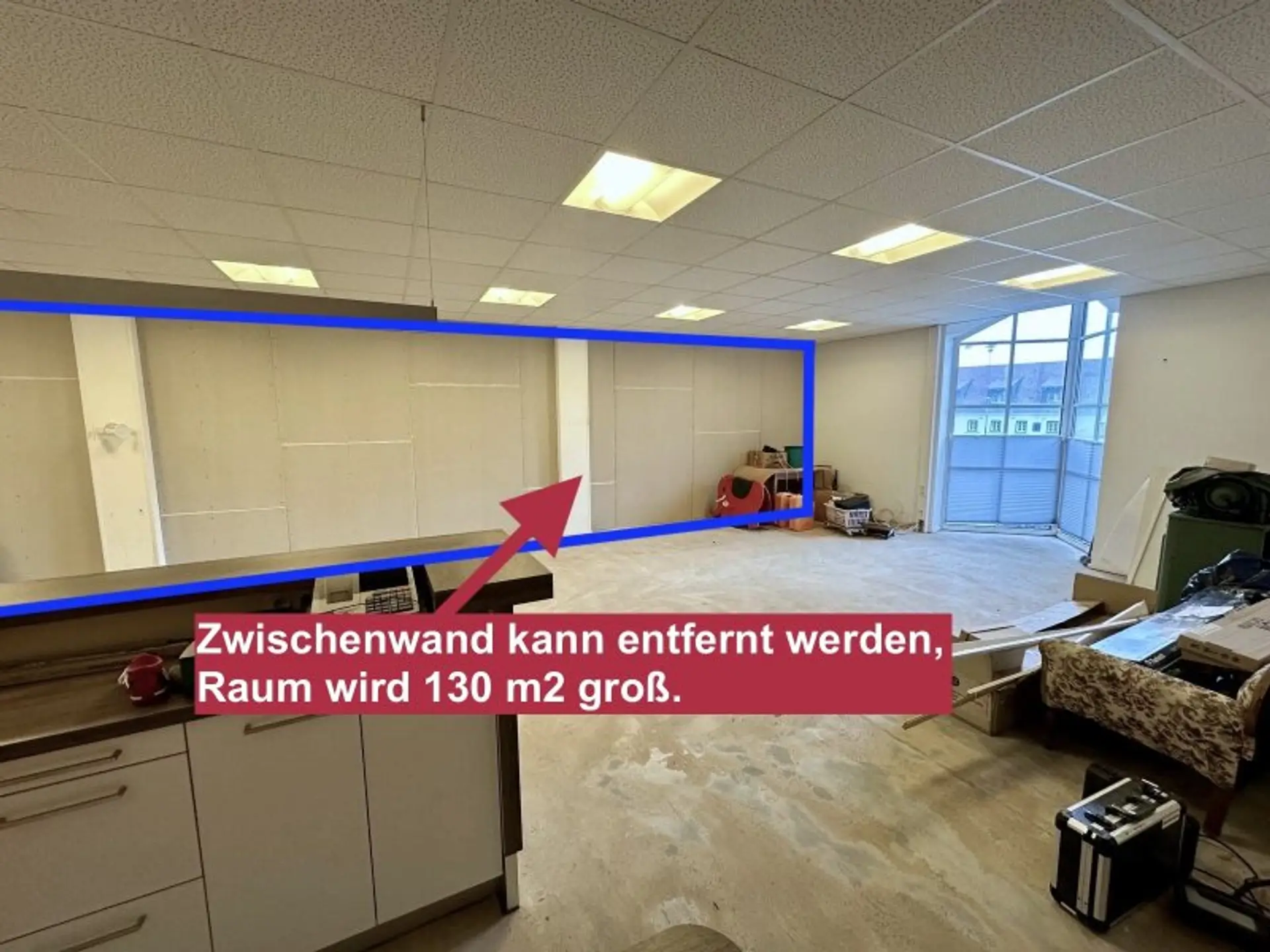 _(Aktuell wird die Mietfläche lt. Plan durch eine Trockenwand geteilt. Diese wird auf Wunsch entfernt - siehe Plan / Bilder)_