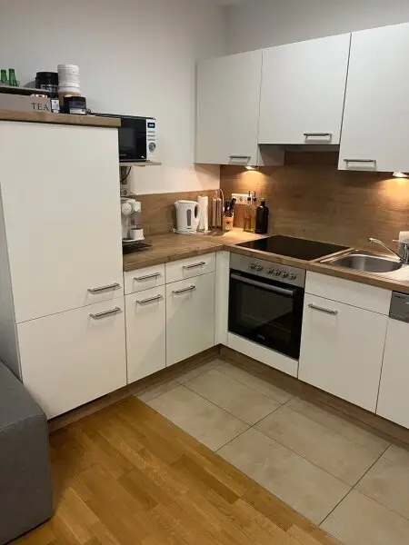 Großzügige bodentiefe Fenster- und Glasflächen, schaffen ein sehr angenehmes Wohnambiente. Die Wohnung ist mit hochwertigen modernen Fliesen und Parkettboden im Schlafzimmer ausgestattet und wird über Fußbodenheizung mit Fernwärme beheizt.