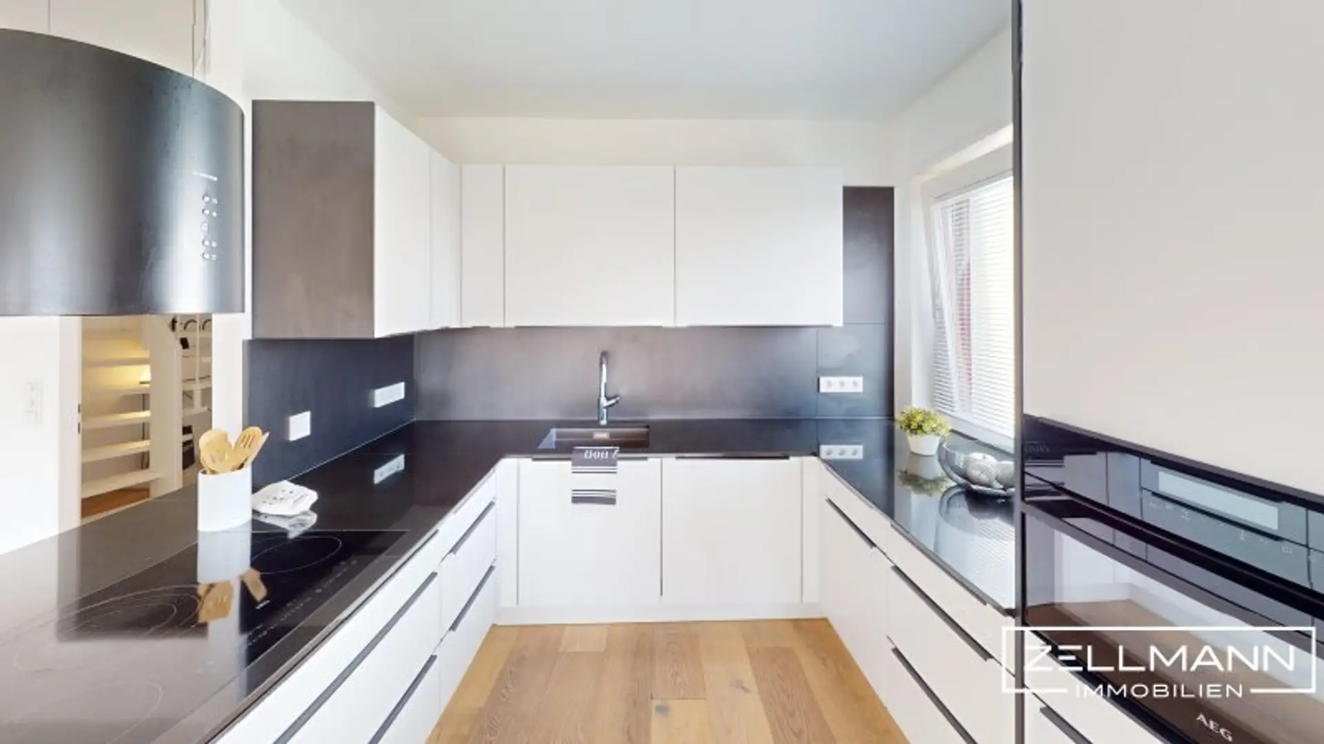 Die hochwertige Küche präsentiert sich modern und funktional zugleich. Eine elegante Kochinsel bildet das Herzstück und bietet sowohl ausreichend Arbeitsfläche als auch einen geselligen Treffpunkt im Alltag. Klare Linien, hochwertige Geräte und durchdachte Stauraumlösungen unterstreichen den zeitlosen Charakter.