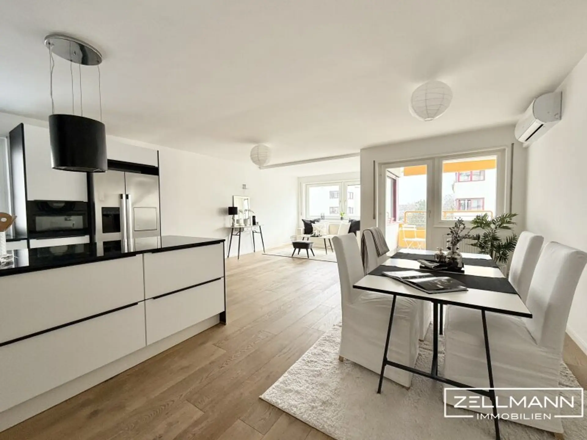 Der zentrale Wohnbereich überzeugt durch seine Offenheit und Großzügigkeit. Die Kombination aus Wohn-, Ess- und Küchenbereich schafft ein modernes, kommunikatives Wohnkonzept. Große Fensterflächen sorgen für viel Tageslicht und ein angenehmes Raumklima, während der direkte Zugang zu einem der Balkone den Wohnraum harmonisch erweitert.
