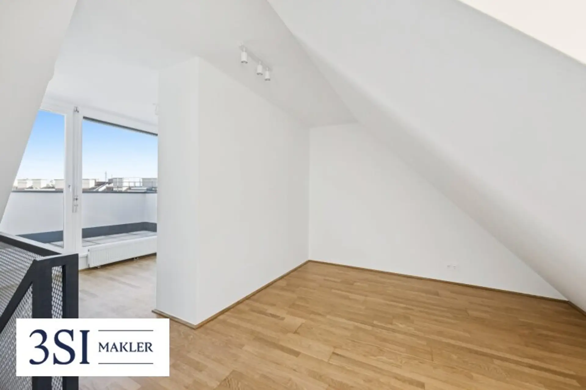 Die untere Ebene empfängt mit einem einladenden Vorraum und führt in den offen gestalteten Wohnbereich mit integrierter Küche, der durch seine Helligkeit und Großzügigkeit besticht. Ein modernes Badezimmer mit Dusche sowie eine separate Toilette sorgen für zusätzlichen Komfort. Über eine innenliegende Treppe gelangt man auf die obere Ebene, die mit einer offenen Galerie vielseitige Nutzungsmöglichkeiten bietet. Die angrenzende Terrasse lädt zum Entspannen ein und rundet dieses attraktive Wohnangebot im Dachgeschoss perfekt ab.
