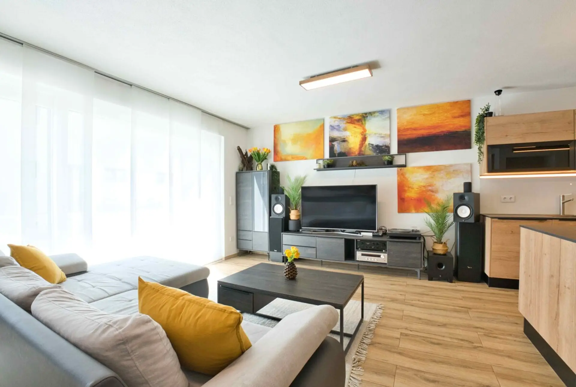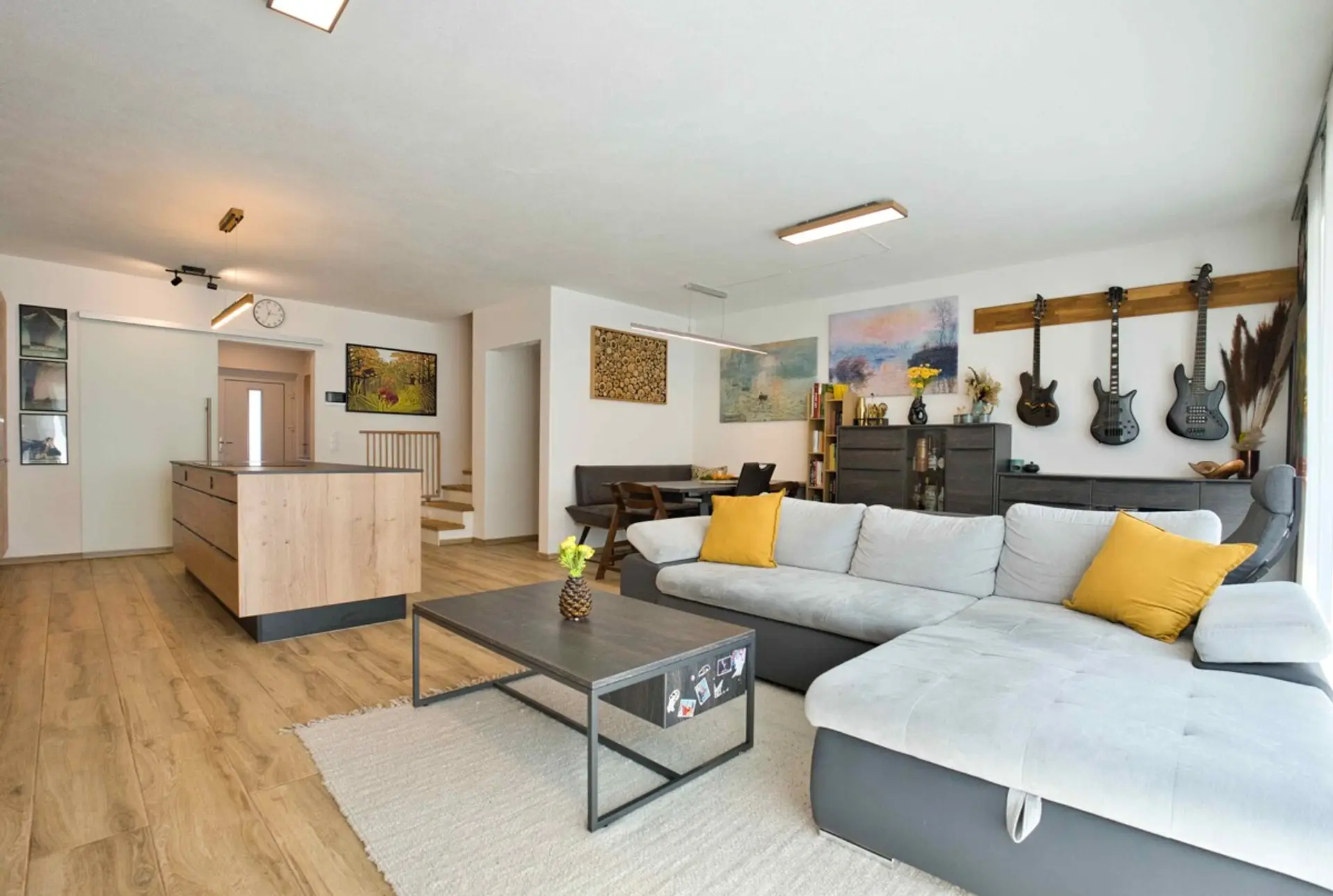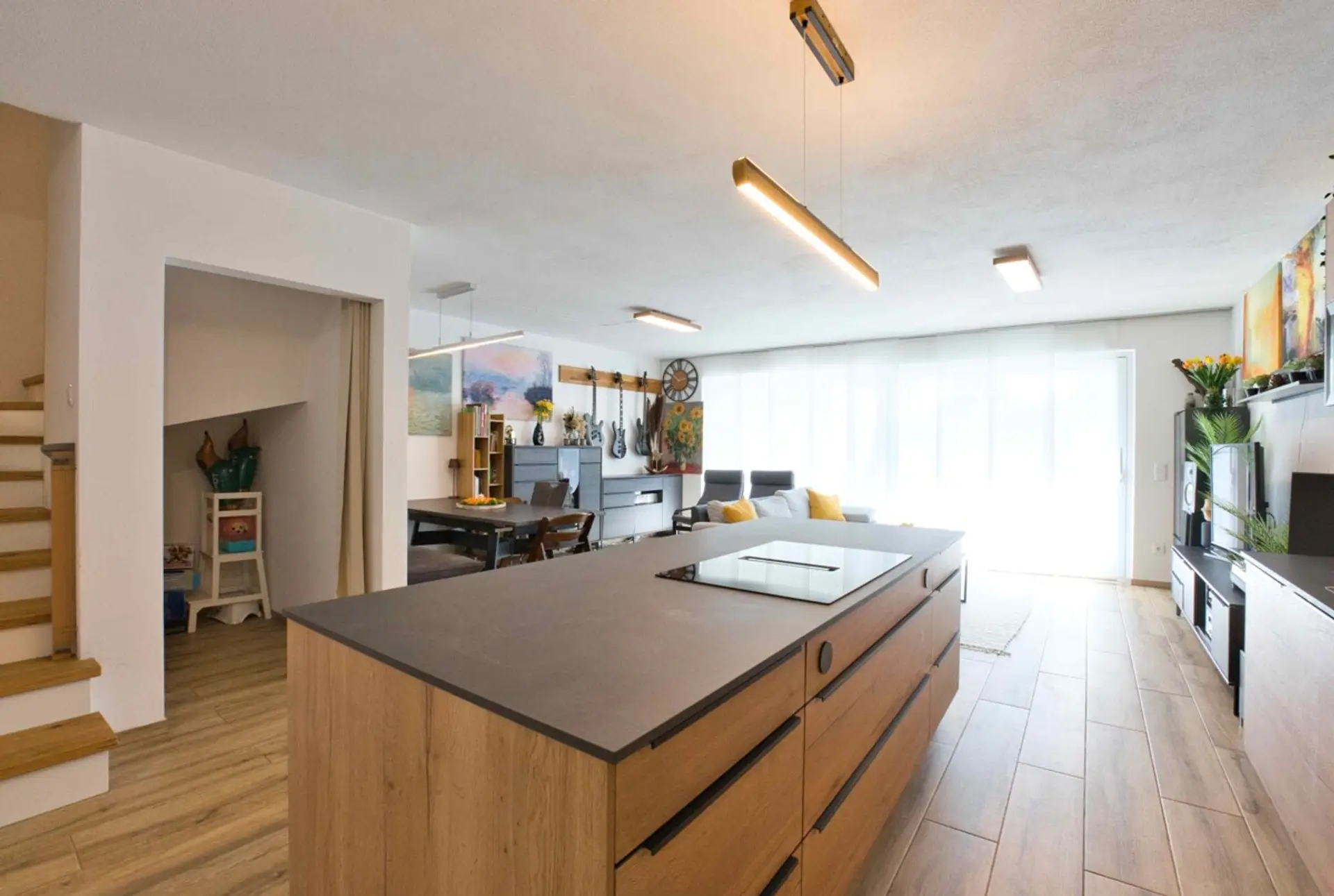 Schon beim Betreten wird die Offenheit und Helligkeit spürbar. Der großzügige Wohn-, Ess- und Küchenbereich bildet das Herzstück des Hauses. Die moderne Küche mit Kochinsel fügt sich harmonisch in den Raum ein und schafft eine kommunikative Atmosphäre – ideal für gemeinsame Zeit mit Familie und Freunden. Große Fensterflächen sorgen für viel Tageslicht und verbinden den Innenbereich nahtlos mit der Terrasse und dem Garten.