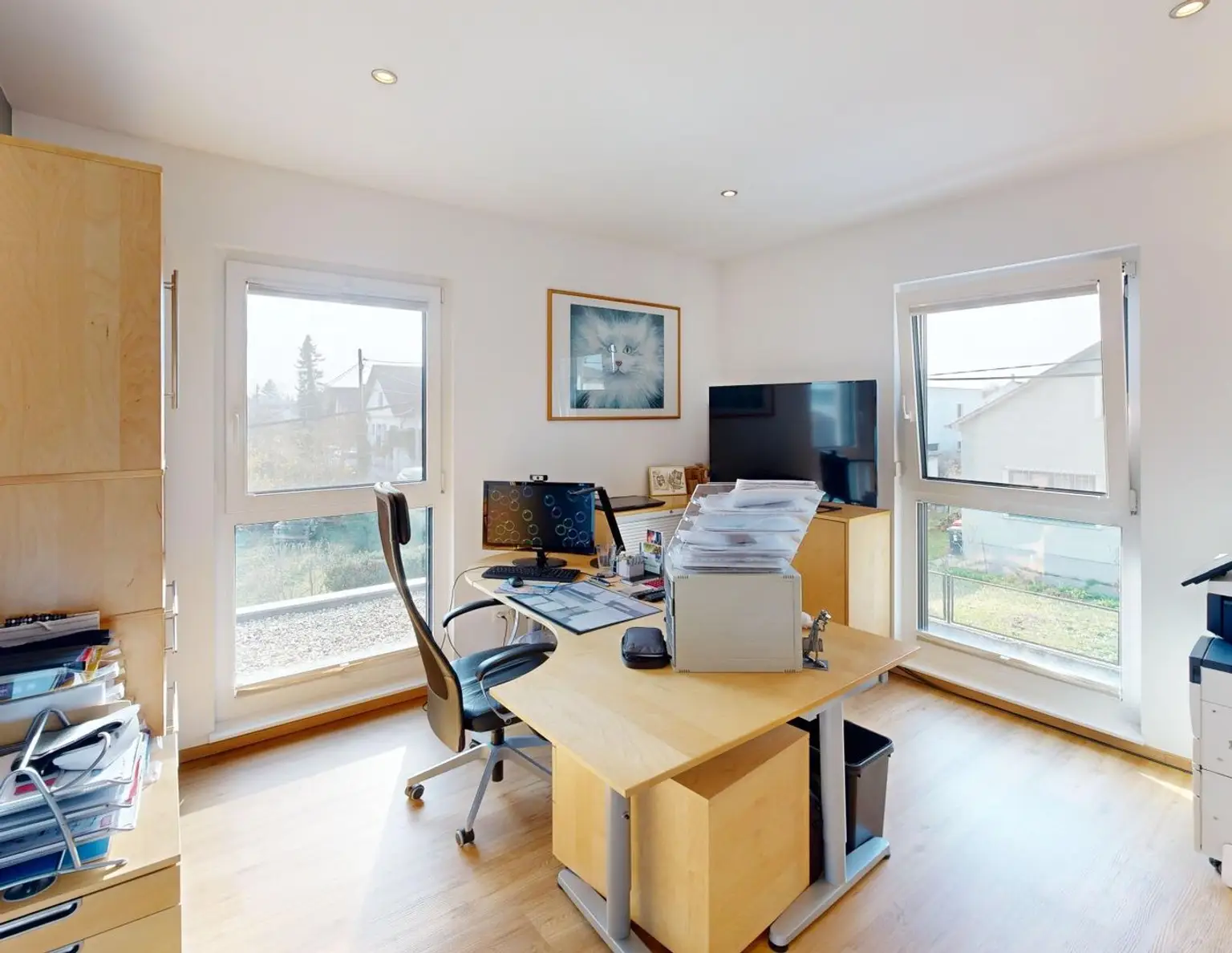 Attraktive Doppelhaushälfte in Fertigteilbauweise (ELK). Das Haus verfügt über ca. 114 m2 Nutzfläche auf zwei Geschossen: Im Erdgeschoss befinden sich eine offene Wohnküche (ca. 32 m2), ein Arbeitszimmer, ein WC mit H…