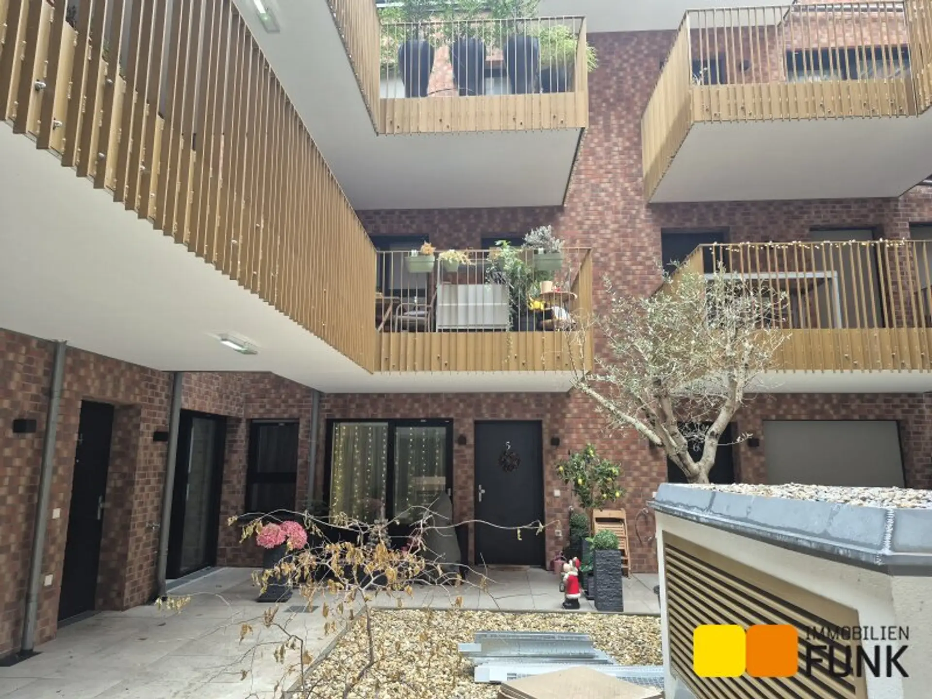 Über die ca. 11 m² große, gepflasterte Terrasse im ruhigen Innenhof betreten Sie die Wohnung. Bereits beim Eintreten empfängt Sie ein geräumiger Garderobenbereich. Von hier gelangen Sie in den zentralen Wohn- und Essbereich mit ca. 24 m², der über zwei Stufen mit der ca. 18 m² großen Küche verbunden ist. Vom Wohnbereich aus sind die beiden weiteren Zimmer der Wohnung mit ca. 11 m² und ca. 10 m² erreichbar. Auf der gegenüberliegenden Seite befinden sich das rund 6 m² große Badezimmer, ausgestattet mit Badewanne, Dusche, Waschtisch, Handtuchtrockner und Waschmaschinenanschluss, sowie ein separates WC. Eine weitere Terrasse mit ca. 4 m² und direktem Zugang von der Küche sorgt für zusätzliches Tageslicht in Küche und Bad. Ergänzend gelangen Sie von der Innenhofterrasse über wenige Stufen zu einer weiteren Freifläche mit ca. 15 m² – ideal zum Entspannen im Freien.