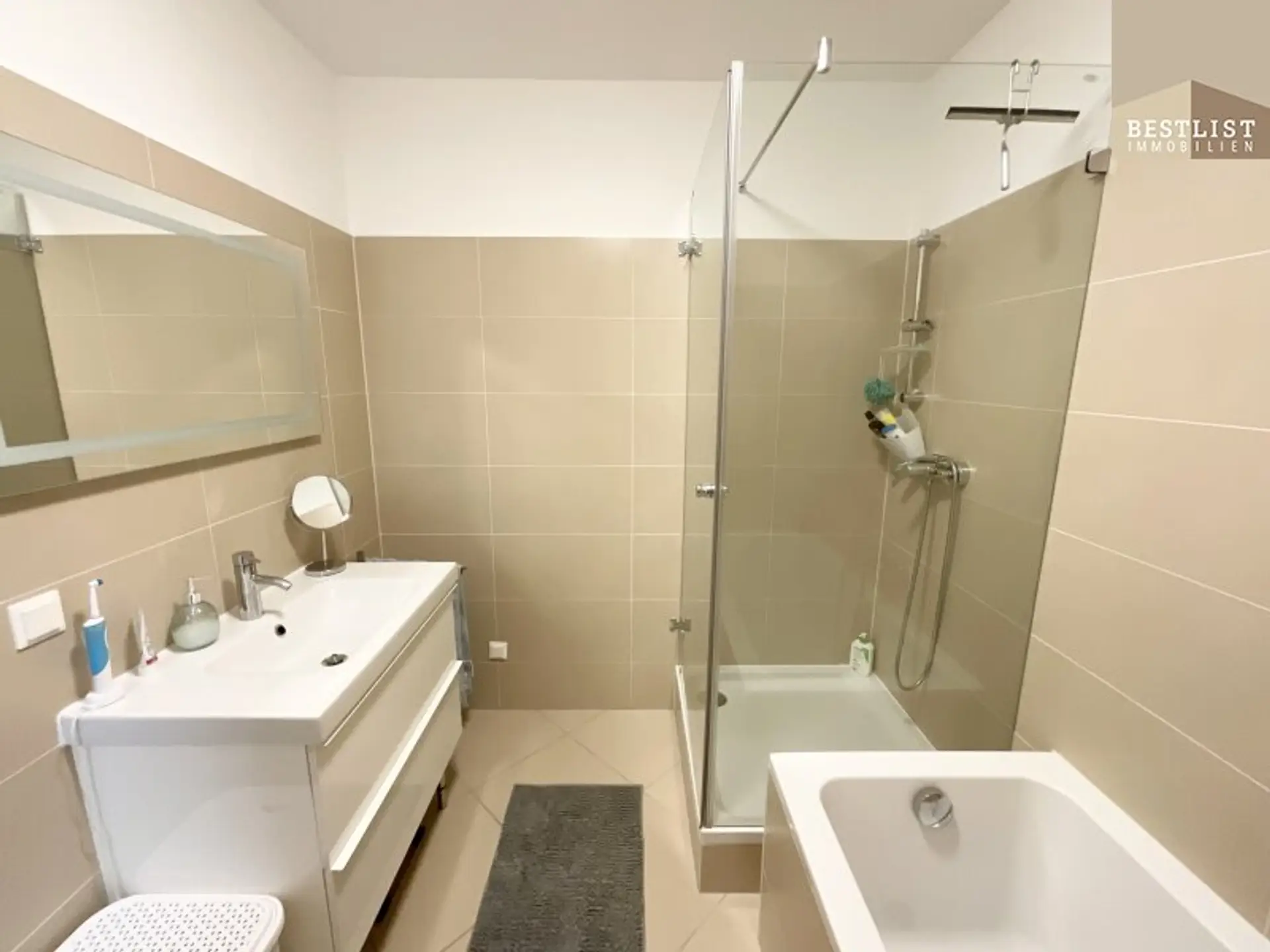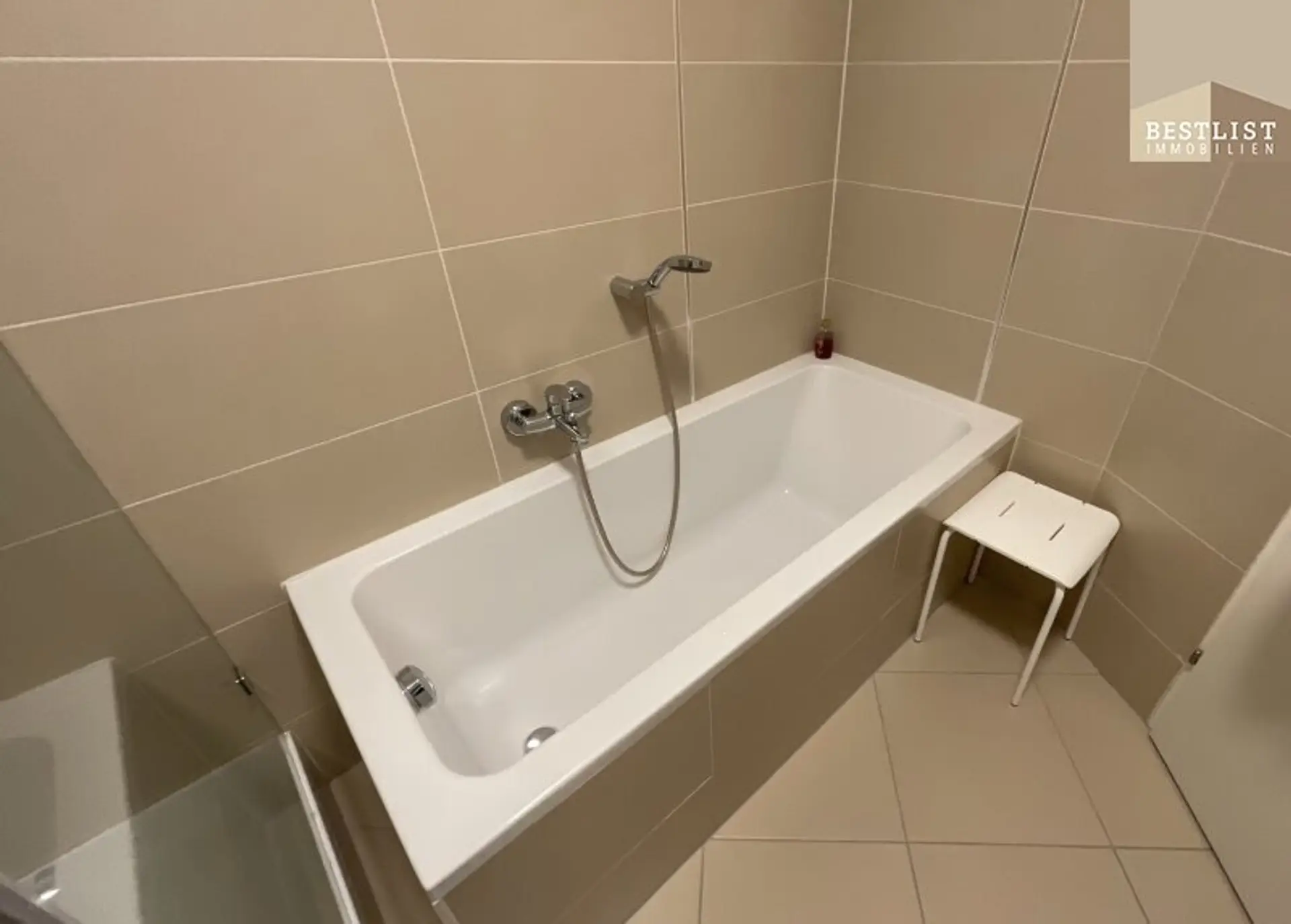 Des weiteren gelangt man über den Wohnbereich ins Badezimmer mit Badewanne und Dusche, einen Abstellraum mit Waschmaschinenanschluss und das Schlafzimmer.