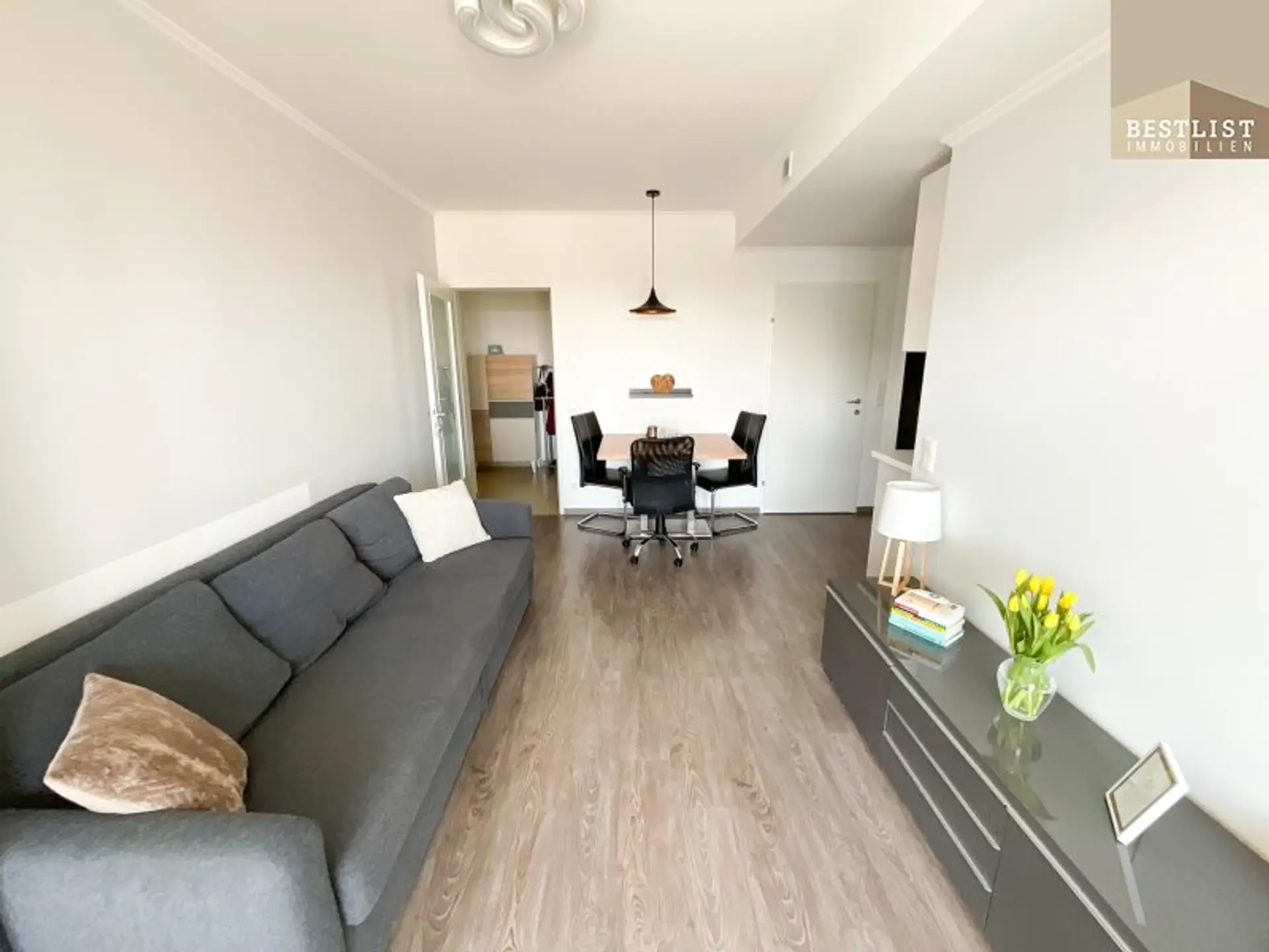 Hier findet man genug Platz für eine gemütliche Couch, einen Esstisch und eine praktische Fernsehwand.
