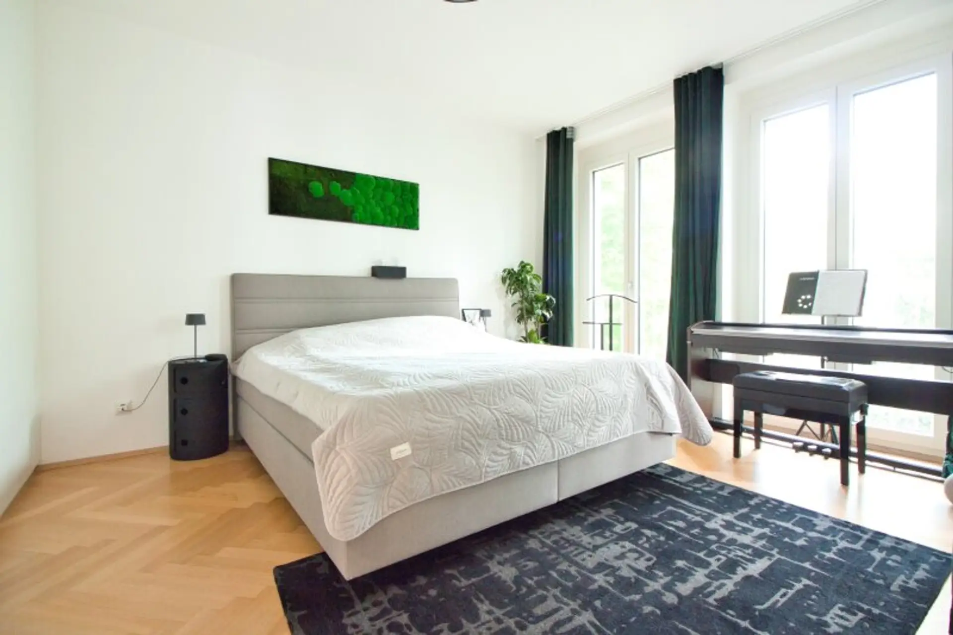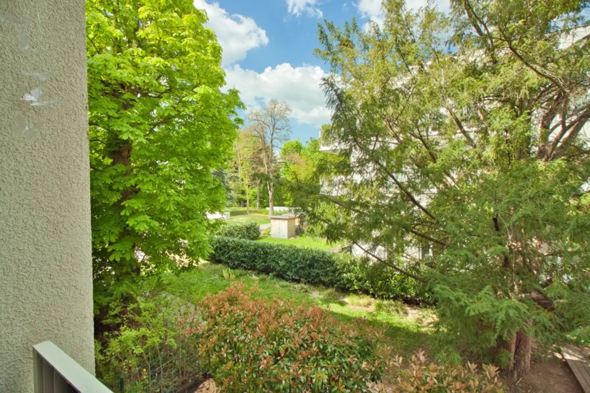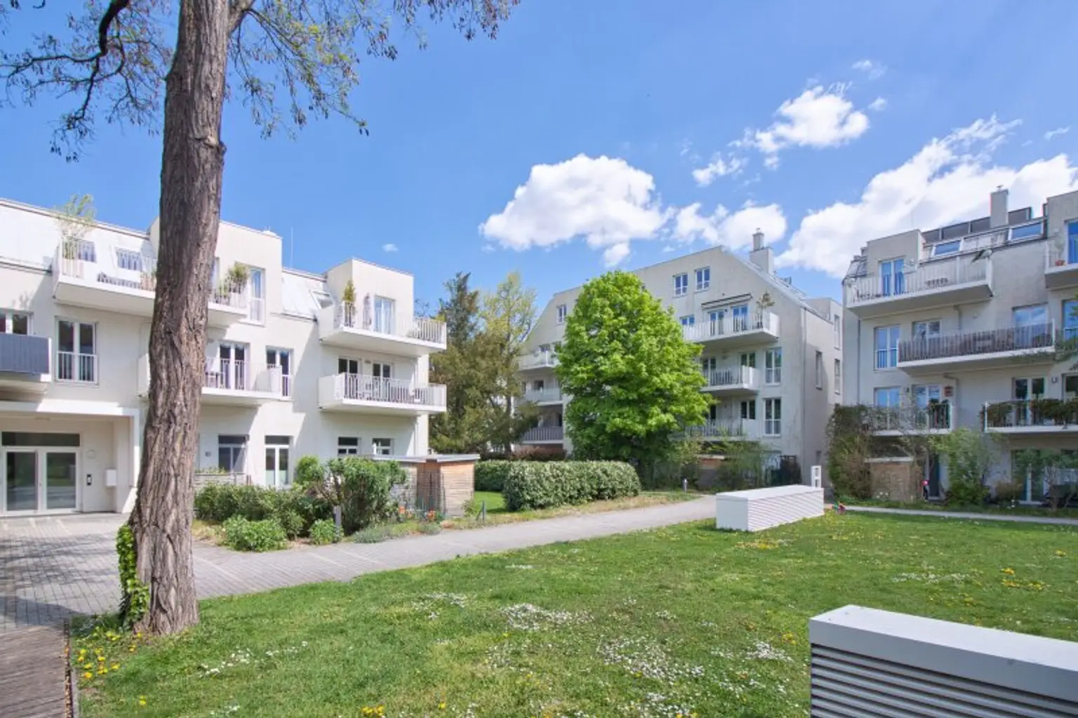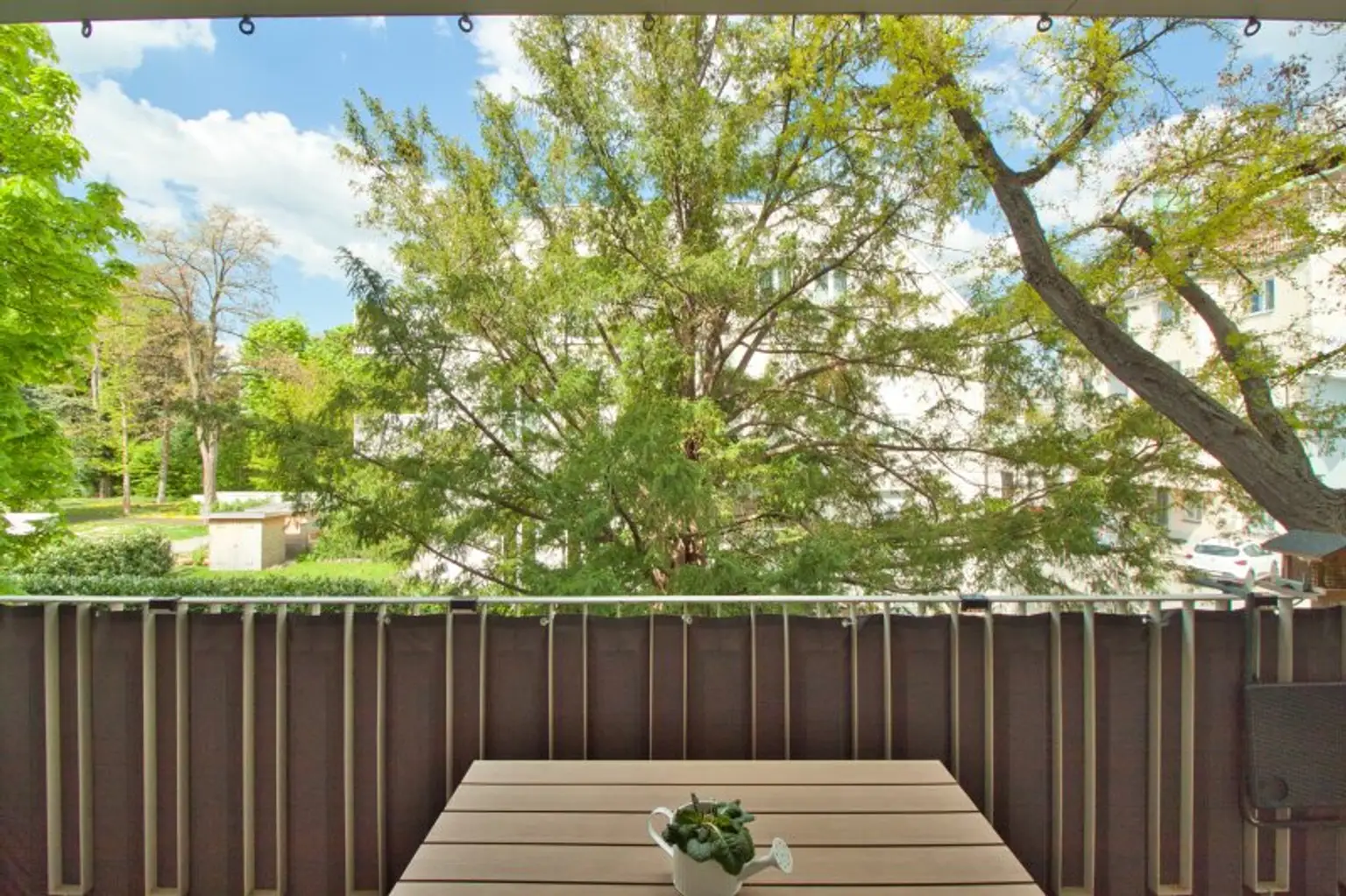 Vom Wohnbereich sowie vom angrenzenden ca. 16 m² großen Master-Bedroom gelangen Sie auf den privaten Balkon mit Blick in den begrünten Innenhof. Umgeben von alten, gewachsenen Bäumen bietet dieser auf ca. 12 m² eine geschützte, private Outdoor-Oase.
