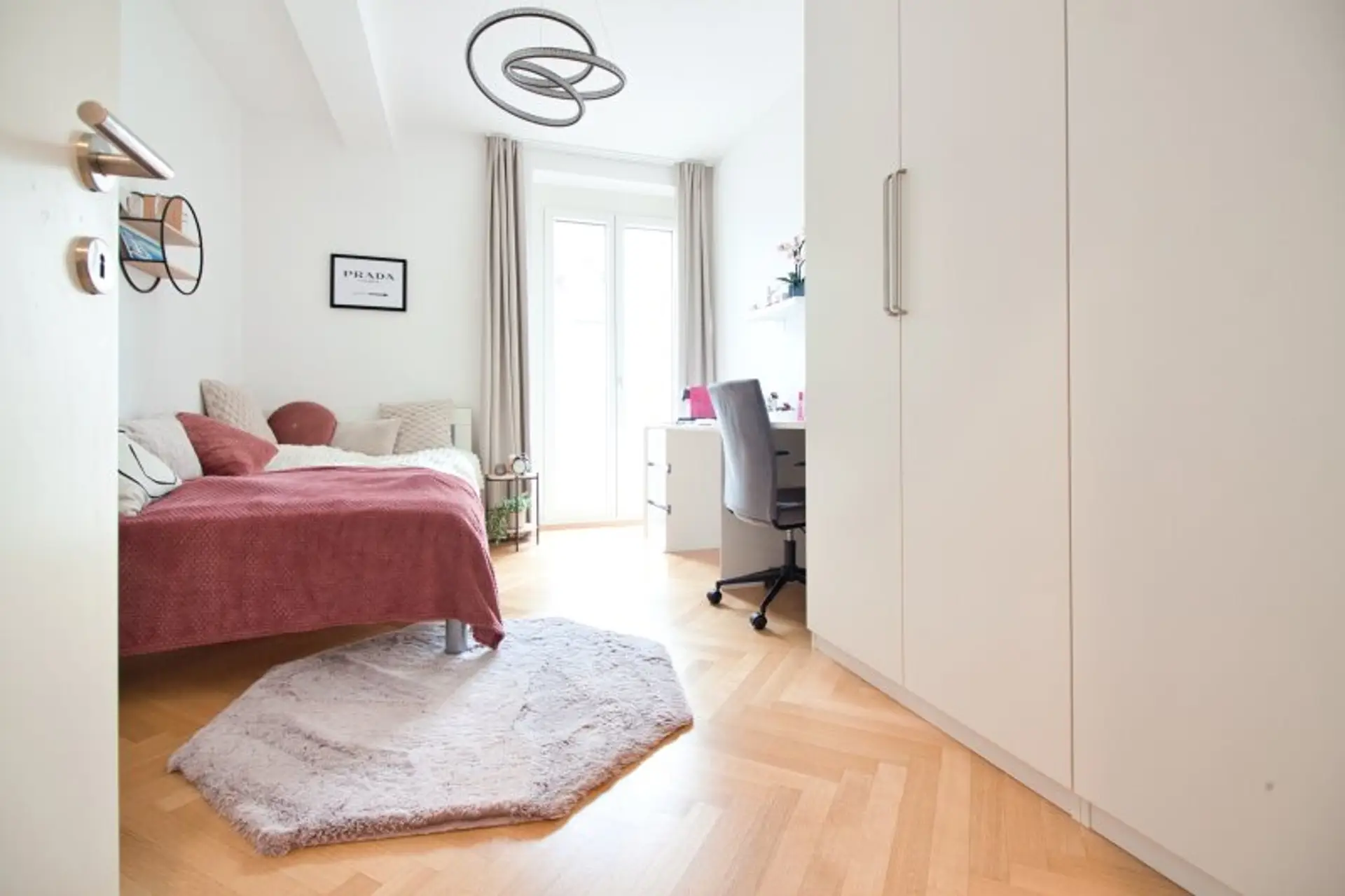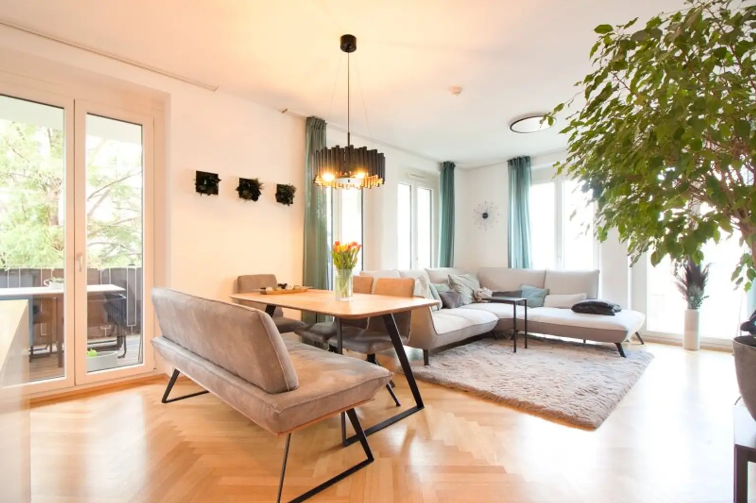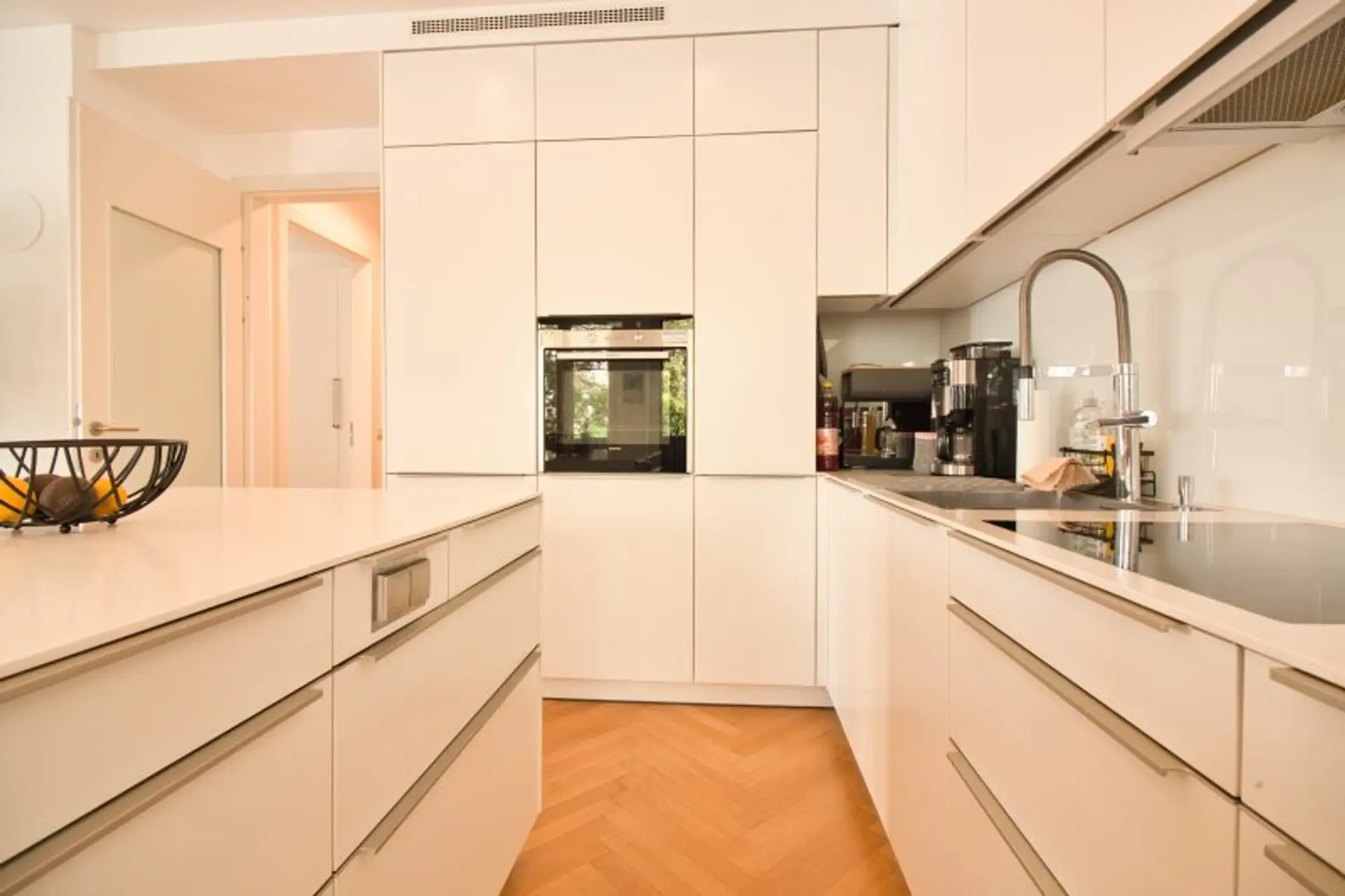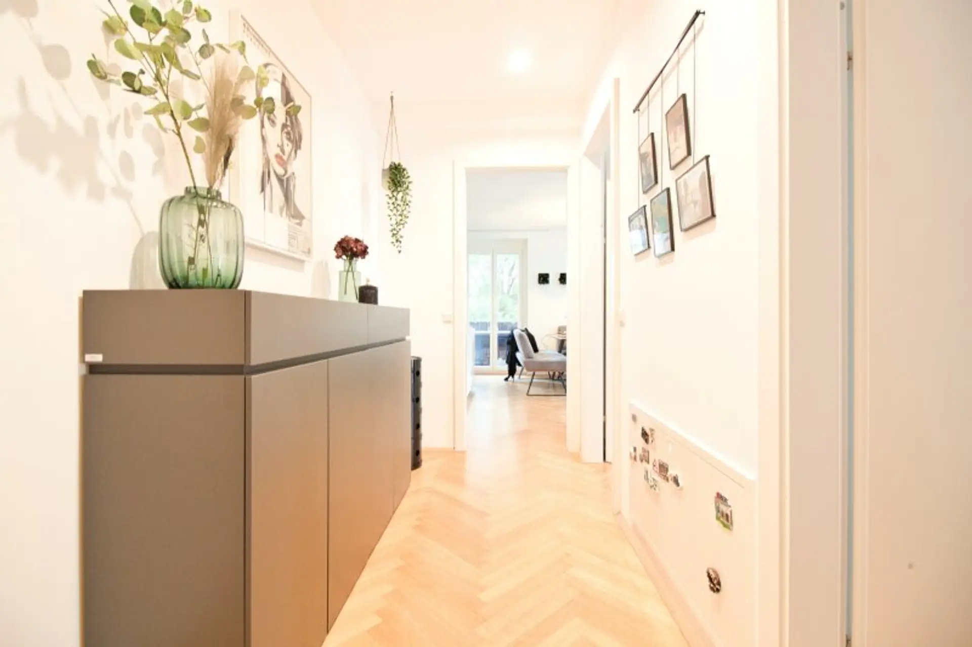 Edler Fischgrät-Parkett, stilvolle Fliesenböden, Fußbodenheizung sowie eine elegante, abgehängte Decke mit dimmbaren Spots (warm bis kaltweiß einstellbar) schaffen ein stimmiges Wohnambiente. Überhohe Türen und eine elektrische Außenbeschattung unterstreichen den modernen, gehobenen Charakter dieser Immobilie.