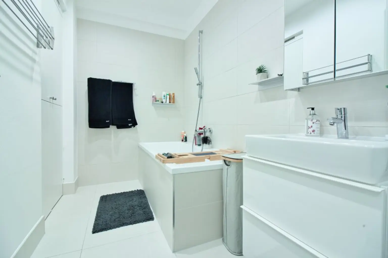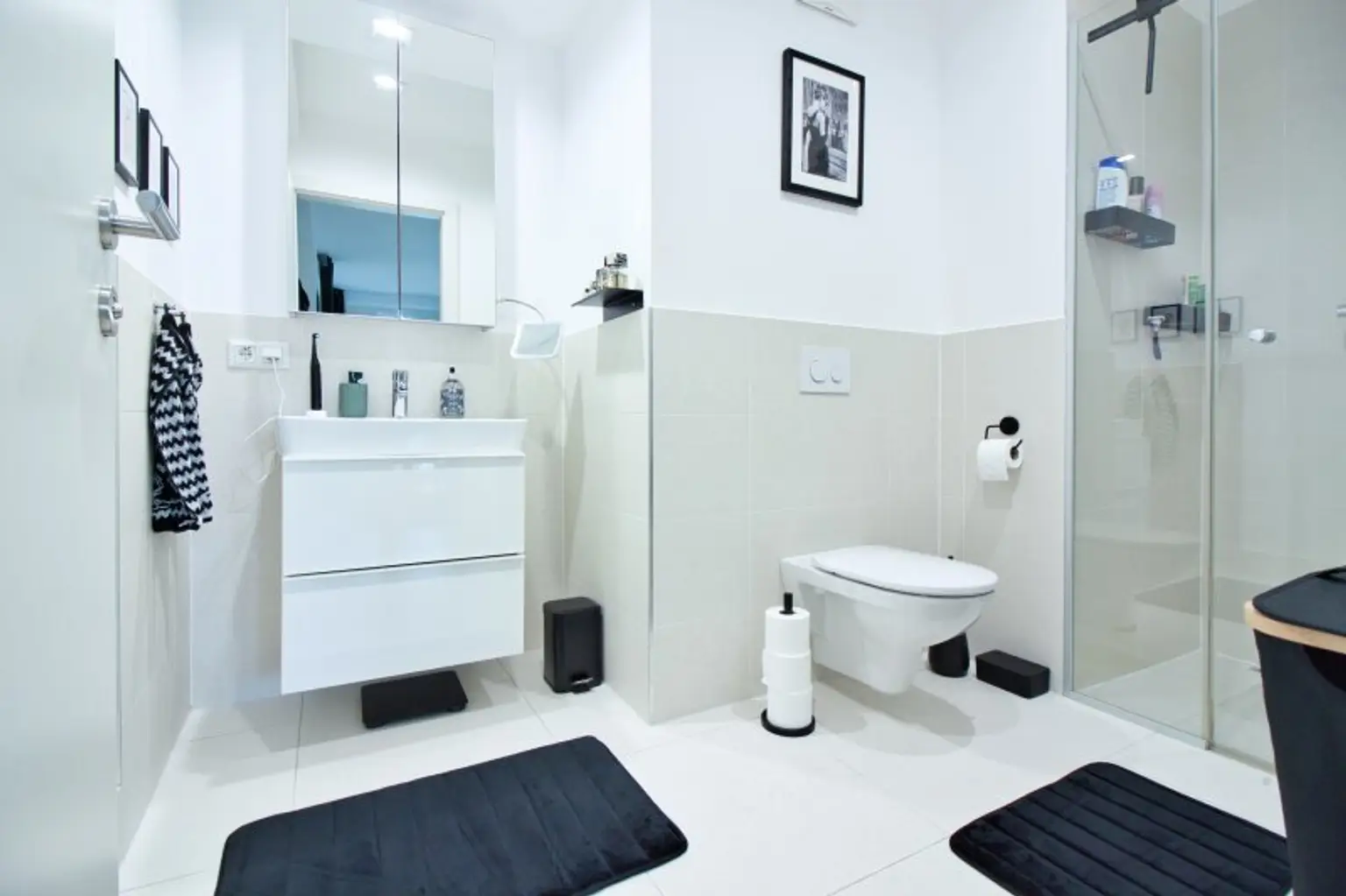Bereits beim Eintreten über die Sicherheitseingangstüre empfängt Sie ein einladender Vorraum mit einer maßgefertigten Garderobe. Linker Hand befindet sich ein separates WC mit Handwaschbecken, daneben ein geschmackvoll ausgestattetes Badezimmer mit Badewanne und Einbauschrank mit Platz für Waschmaschine und Trockner.