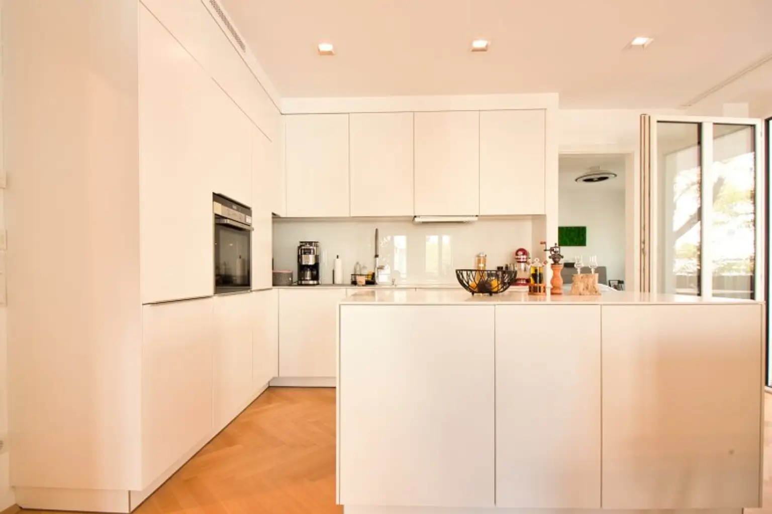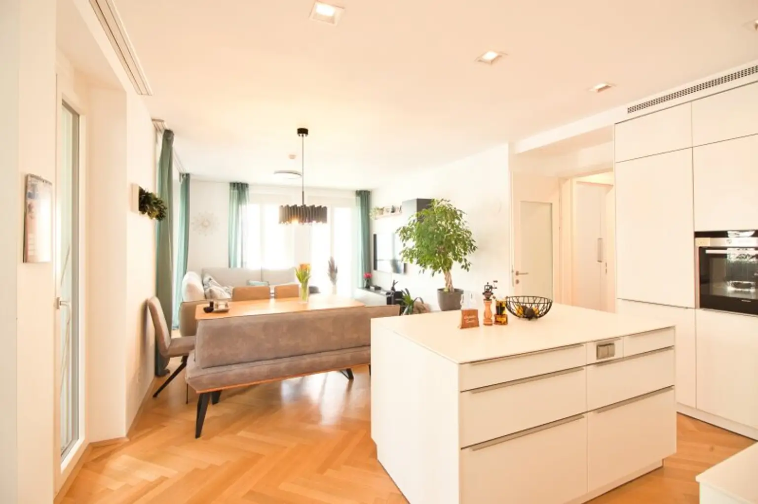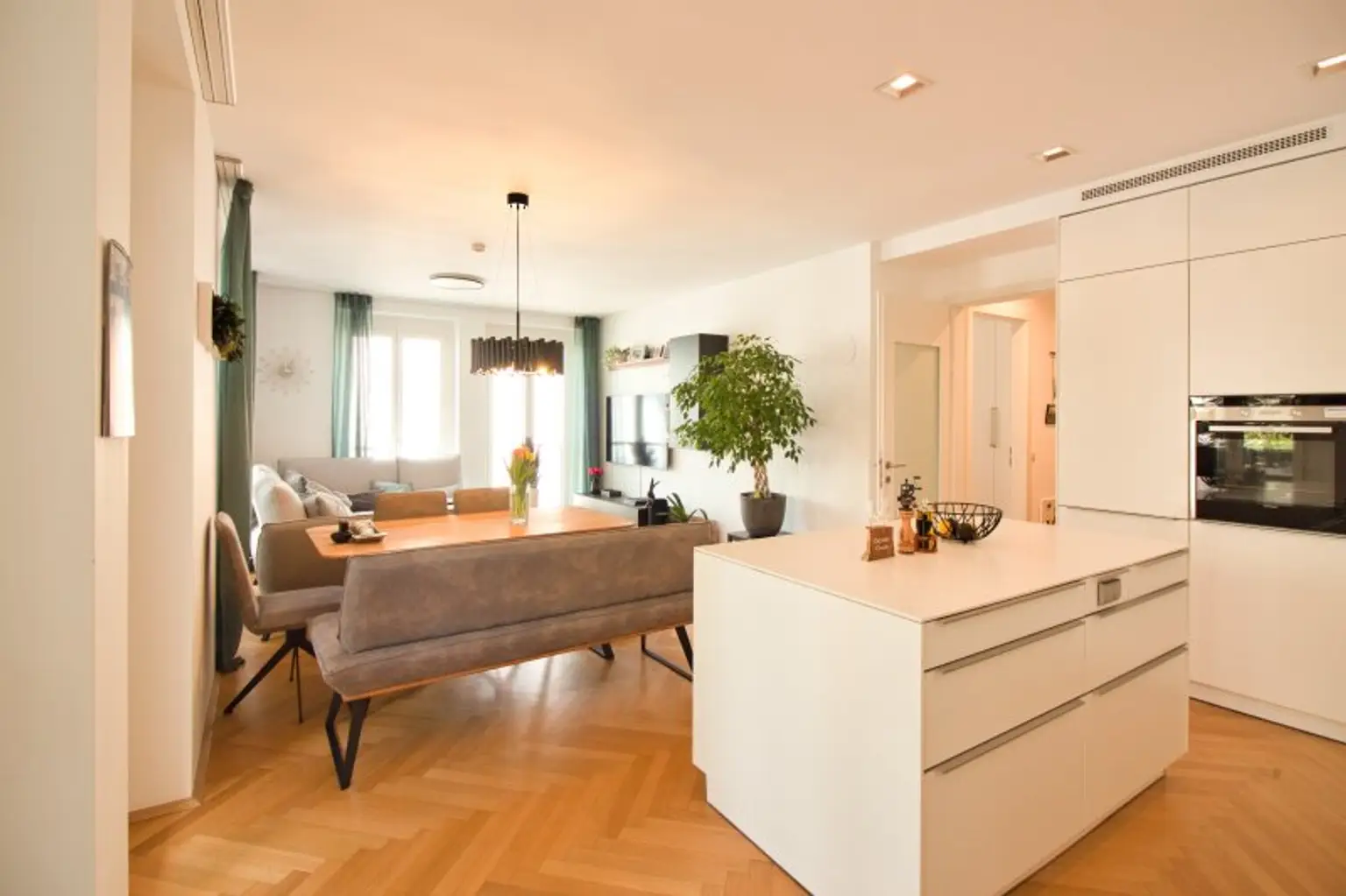 Das Herzstück der Wohnung bildet der rund 33 m² große Wohnbereich: offen, hell und vielseitig gestaltbar. Hier lassen sich Wohnen, Essen und Leben harmonisch vereinen. Die hochwertige EWE-Küche ist bereits integriert und mit Keramikplatte, Siemens-Geräten sowie einem Liebherr-Einbaukühlschrank ausgestattet – funktional und stilvoll zugleich.