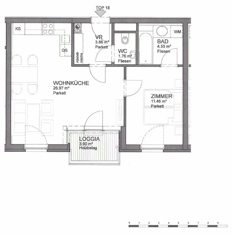 • Bad mit Badewanne, Waschbecken und Waschmaschinenanschluss