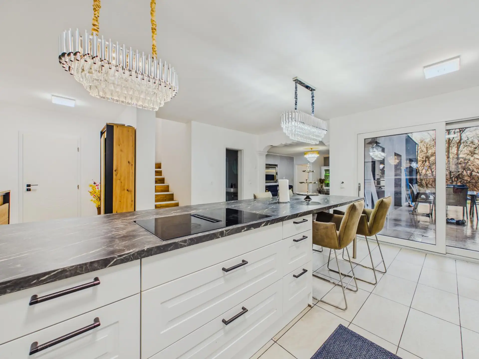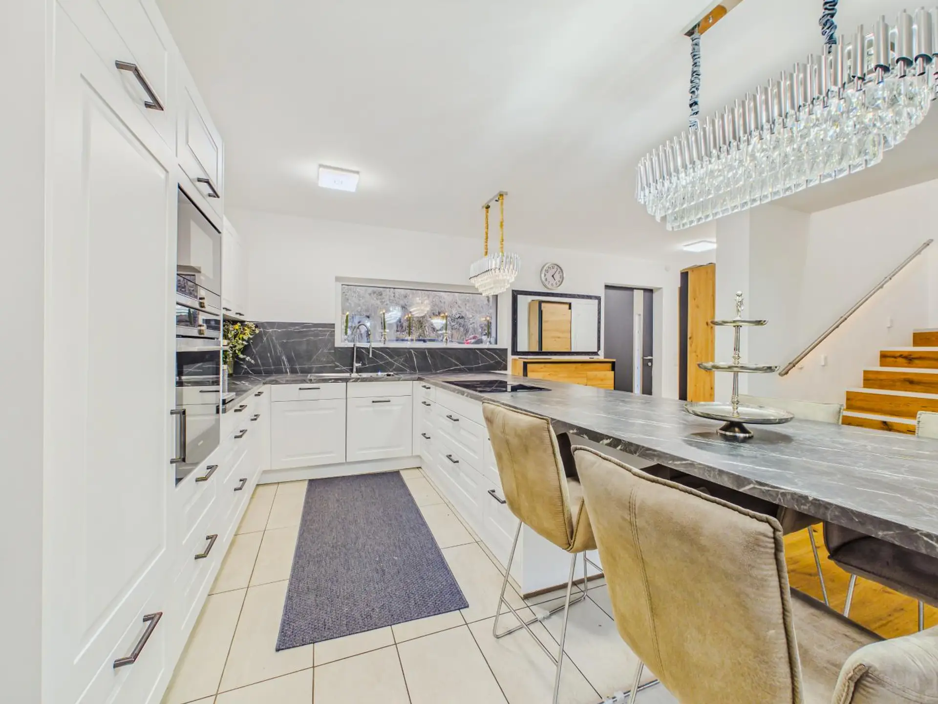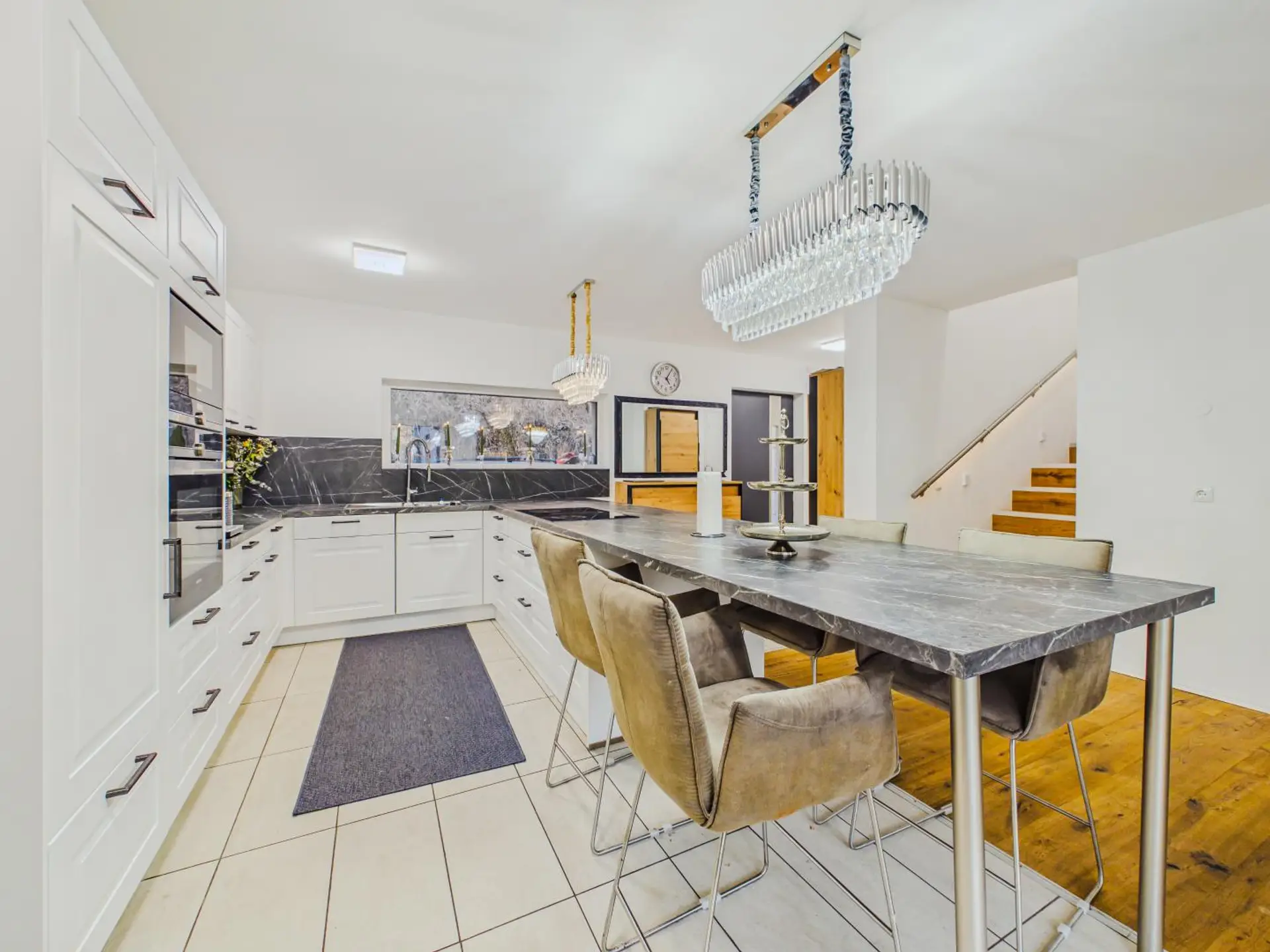 Das absolute Herzstück ist jedoch der großzügige Wohn- und Essbereich mit offener Küche. Die hochwertige Einbauküche fügt sich harmonisch in den Raum ein und schafft gemeinsam mit der offenen Gestaltung ein modernes Wohngefühl.