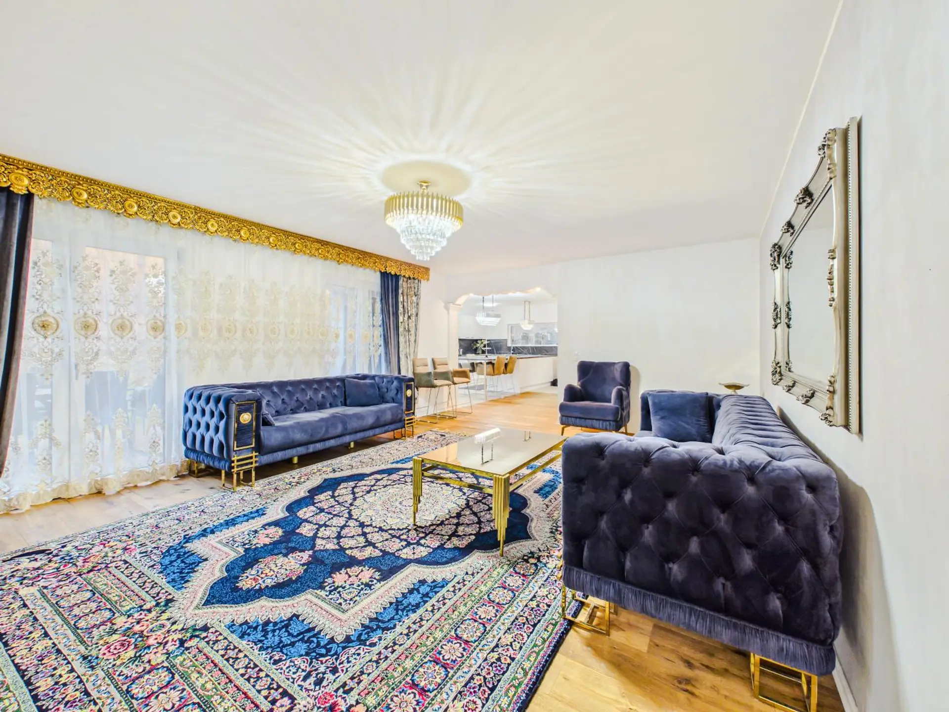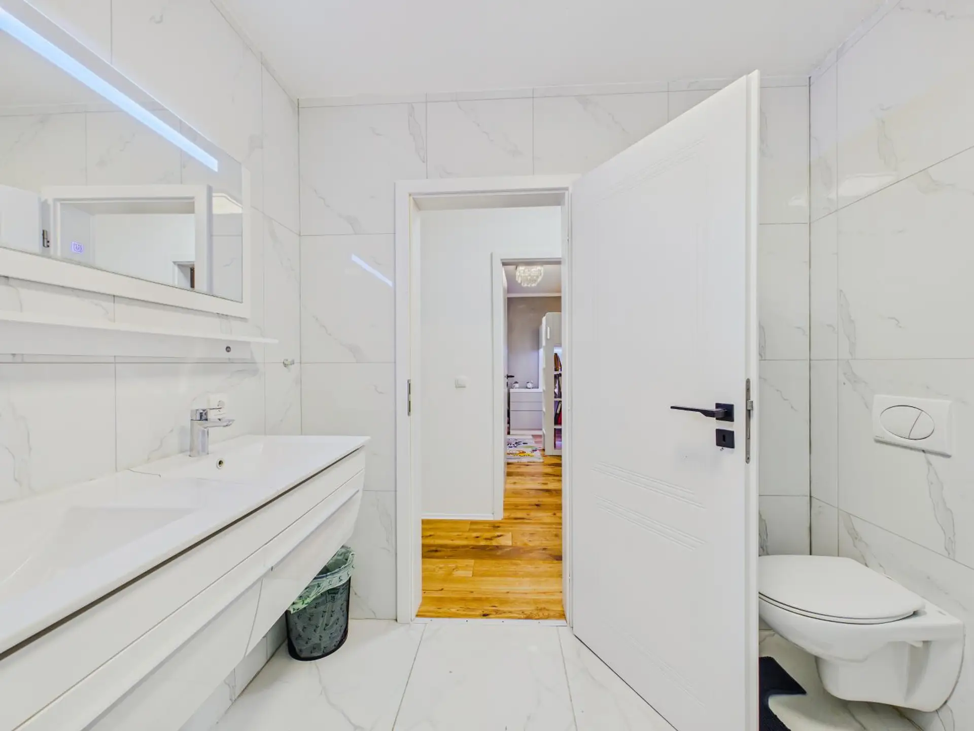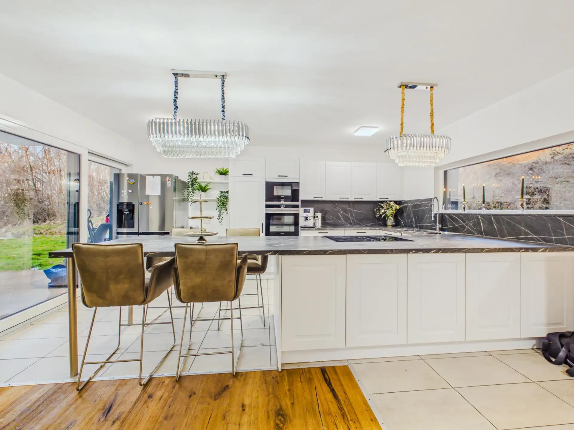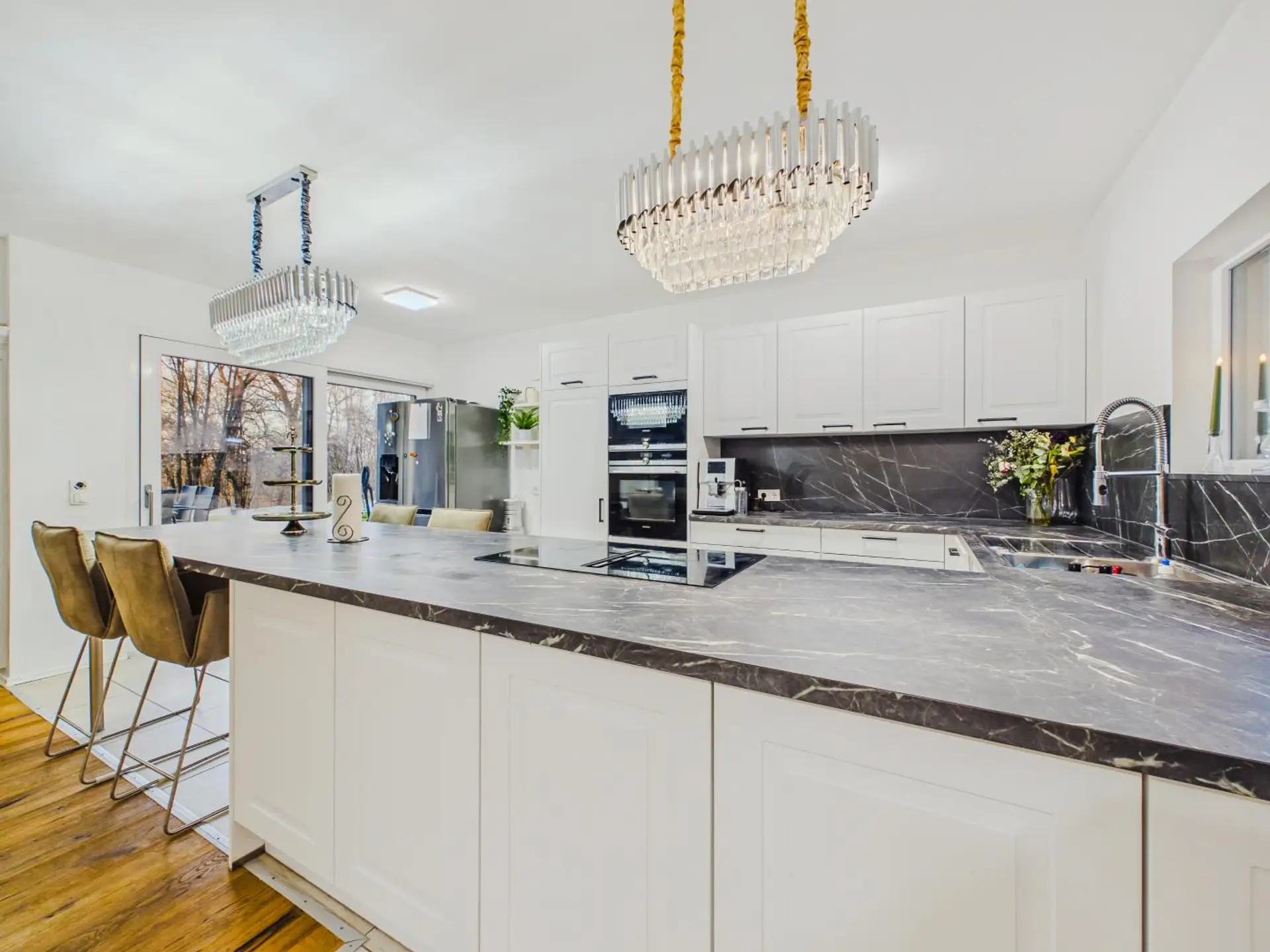 Das absolute Herzstück ist jedoch der großzügige Wohn- und Essbereich mit offener Küche. Die hochwertige Einbauküche fügt sich harmonisch in den Raum ein und schafft gemeinsam mit der offenen Gestaltung ein modernes Wohngefühl.