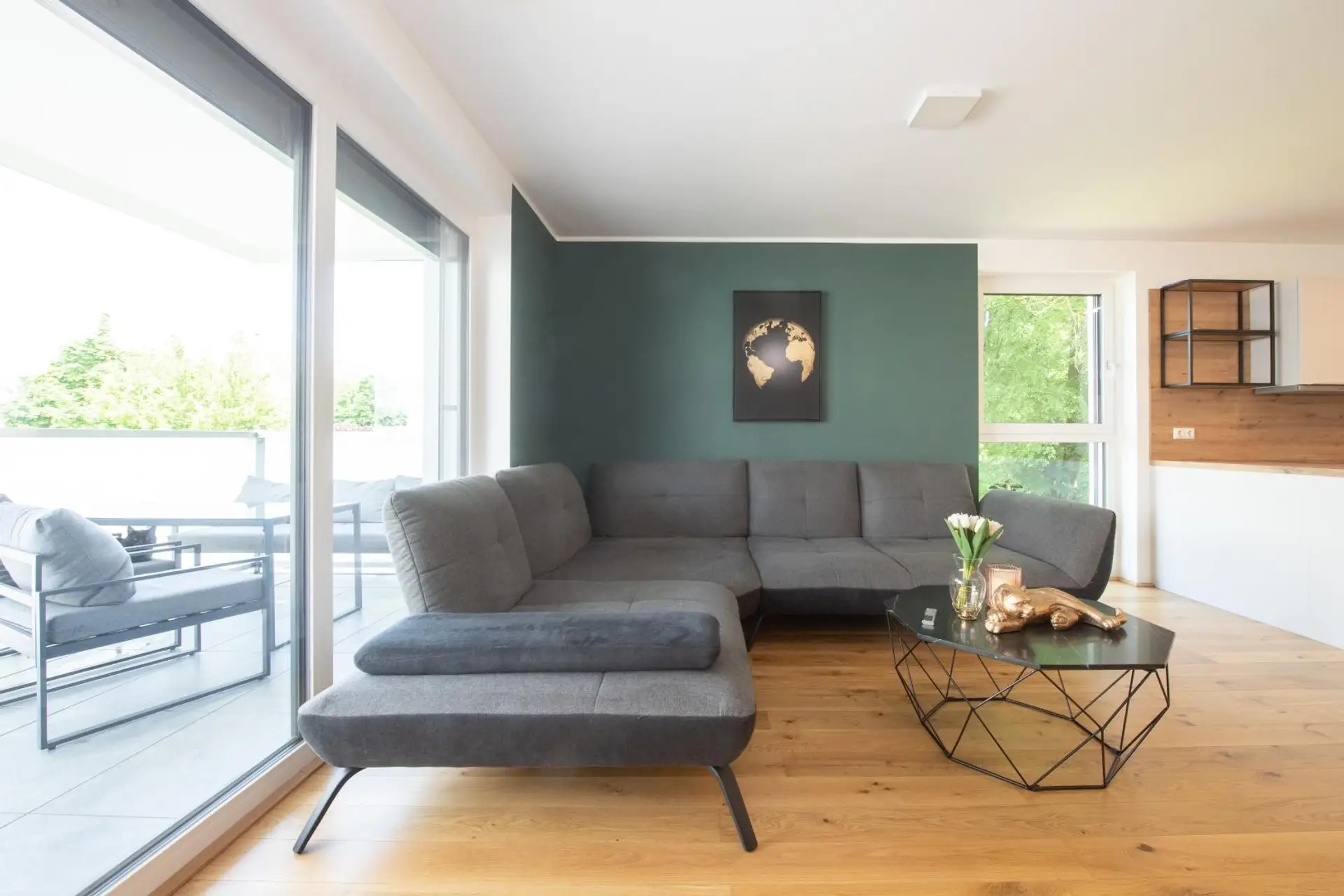 Großzügige bodentiefe Fensterfronten sorgen für lichtdurchflutete Wohnräume und schaffen ein harmonisches Zusammenspiel von Innen- und Außenbereich.